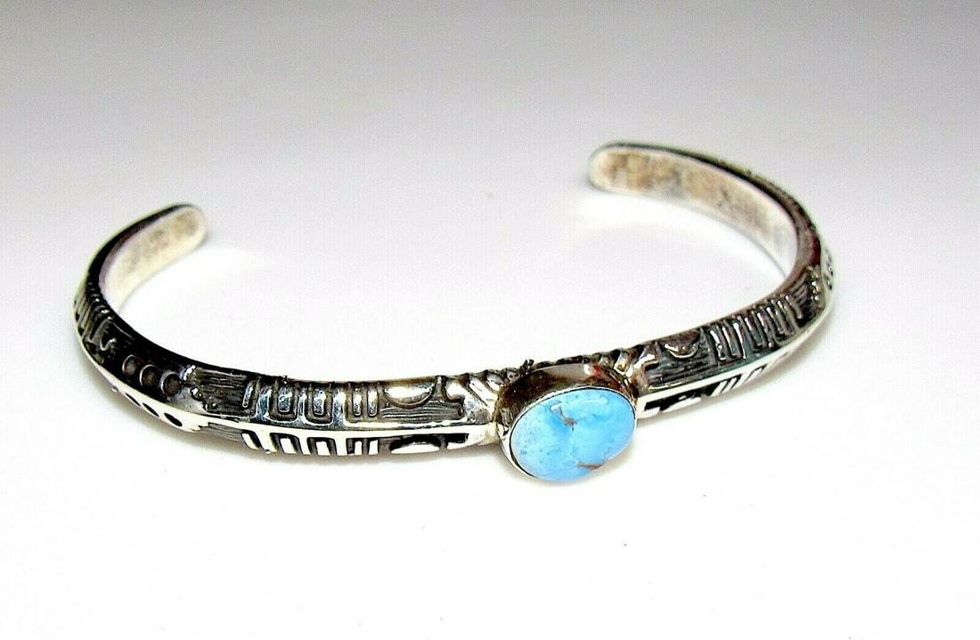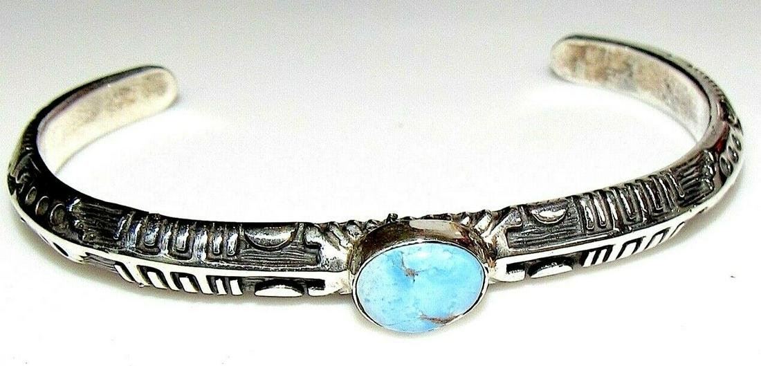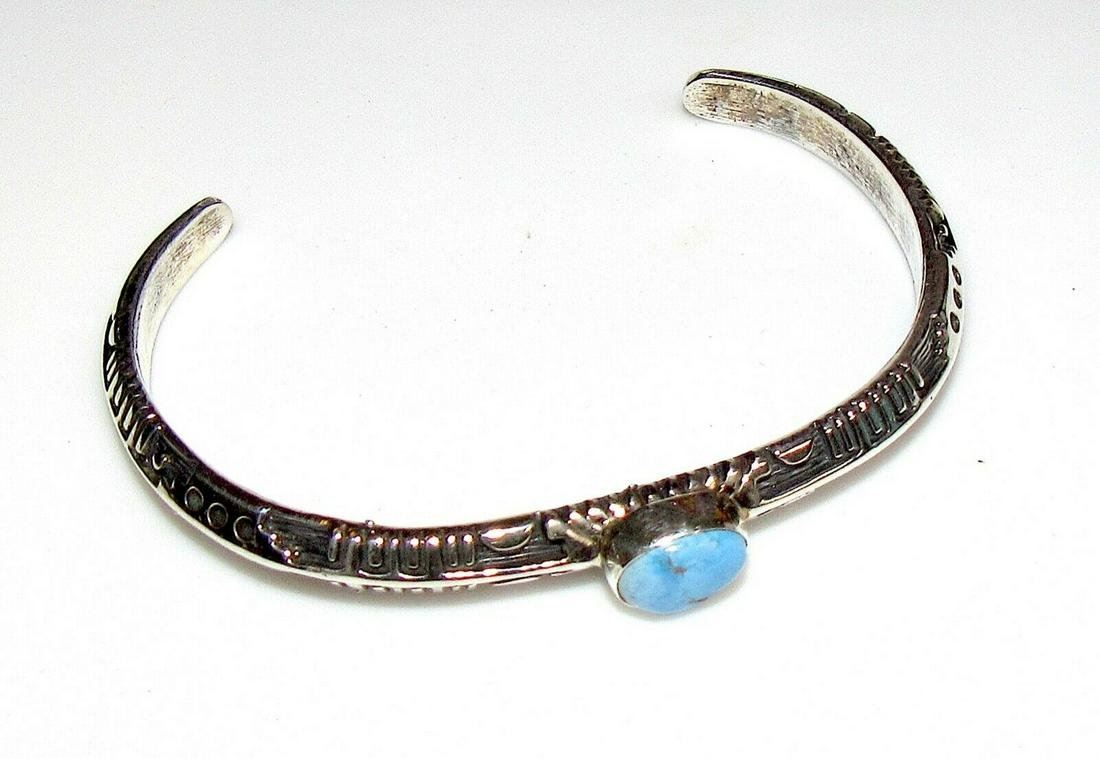 Fab Navajo sterling silver and gorgeous Golden Hills turquoise cuff bracelet. Intricately hand etched Navajo design in sterling silver, accented with a stunning, oval shape Golden Hills turquoise cabochon. Stamped sterling, signed by the artist, the inside circumference is about 6 3/4", can be carefully adjusted. Will make a great stacker cuff or is wonderful if worn by itself. Stunning stone, wonderful statement piece, thick gauge silver.