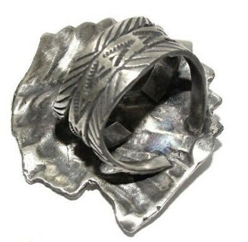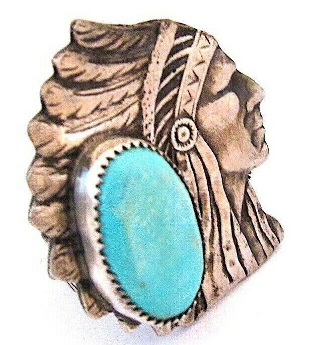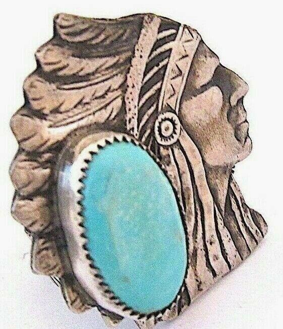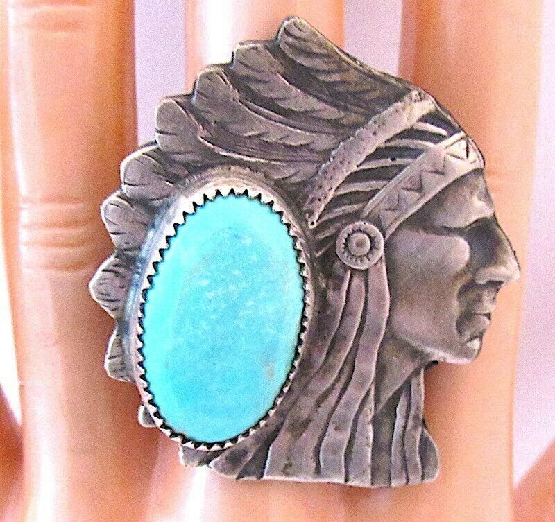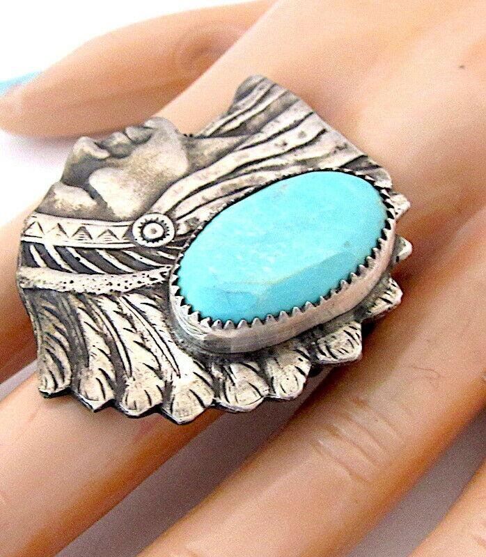 For your consideration is this stunning Native American Navajo sterling silver and turquoise Native American Chief ring size 9. The ring features an intricately hand etched, detailed chief design in sterling silver and is accented with a large, gorgeous, Kingman turquoise cabochon. Phenomenal craftsmanship, superb attention to detail. Signed by the artist "CR" on the band, stamped sterling. Outstanding example of Native American art to add to any jewelry collection! Statement piece!