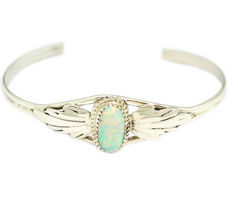 Navajo sterling silver opal cuff bracelet with a traditional squash blossom design. Sterling silver bracelet with a 7x14mm oval white opal stone with twist wire border and cast leaves on the sides on a double wire shank. Center measures approximately 5/8" wide and tapers down. Inside circumference is about 6.5" including gap and is adjustable. It is Navajo hand crafted by the collectible L. Yellowhair. Signed, marked, tested.