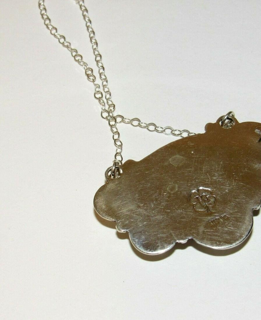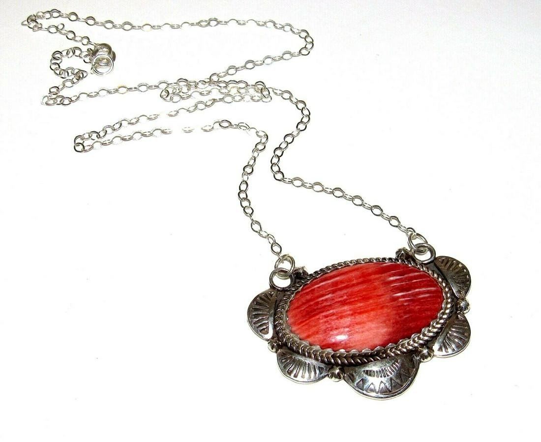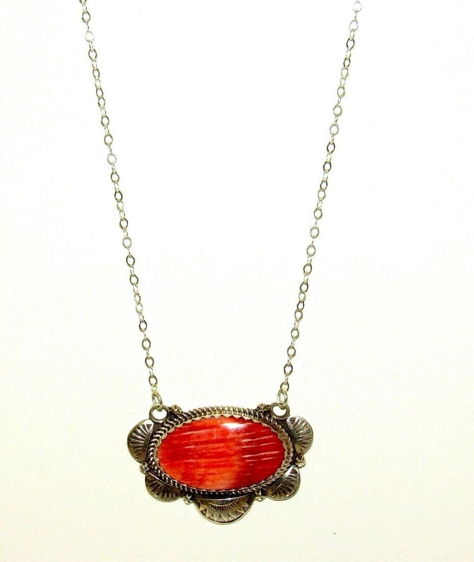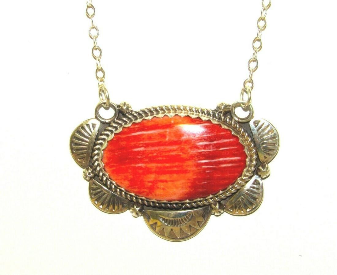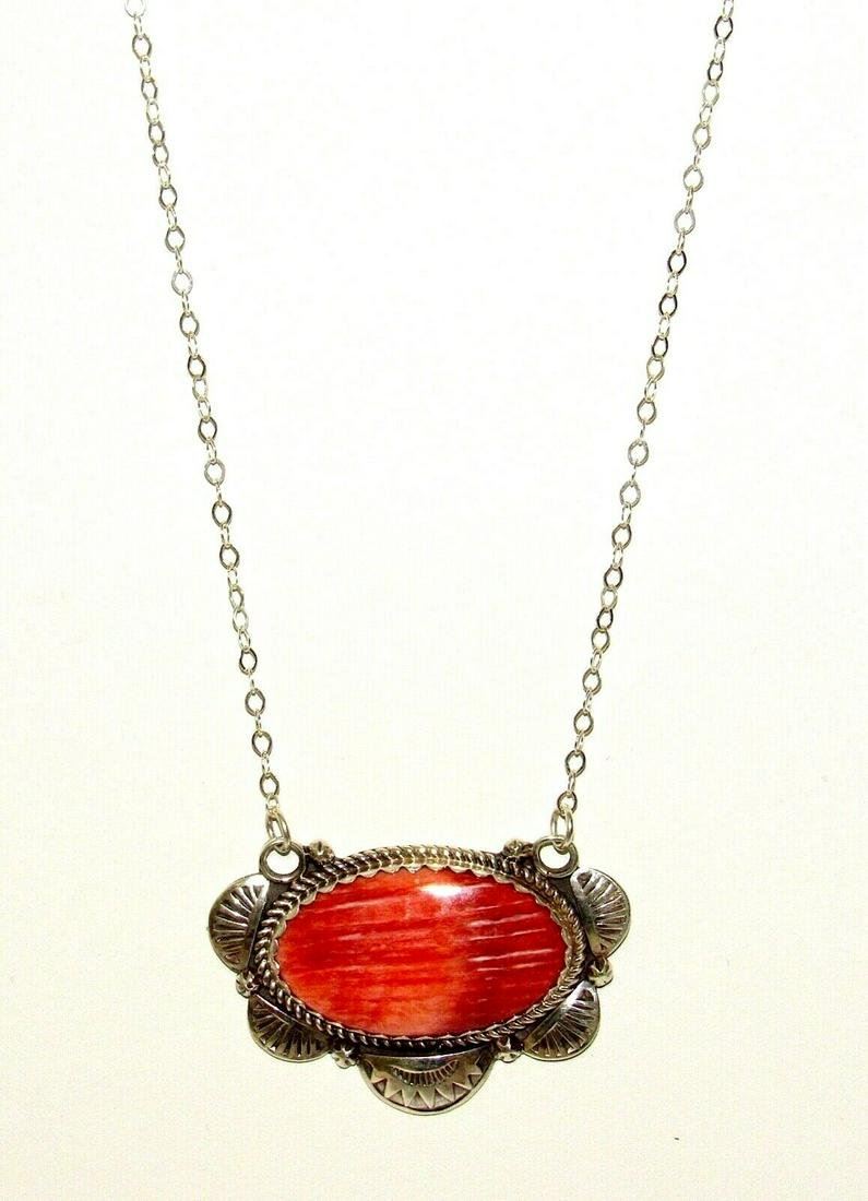 For your consideration is this gorgeous Navajo sterling silver and orange spiny oyster bar necklace by the collectible Navajo artist L. Goodluck. Stunning stone and intricately hand etched, detailed design in sterling silver. The necklace is about 20" long. The spiny bar pendant measures about 1 1/2" wide by 1" tall. Stamped "sterling" and is signed by the artist, features the artist's hallmark. Gorgeous stone, sterling chain necklace, collectible artist. Stunning example of collectible, wearable Native American art!
