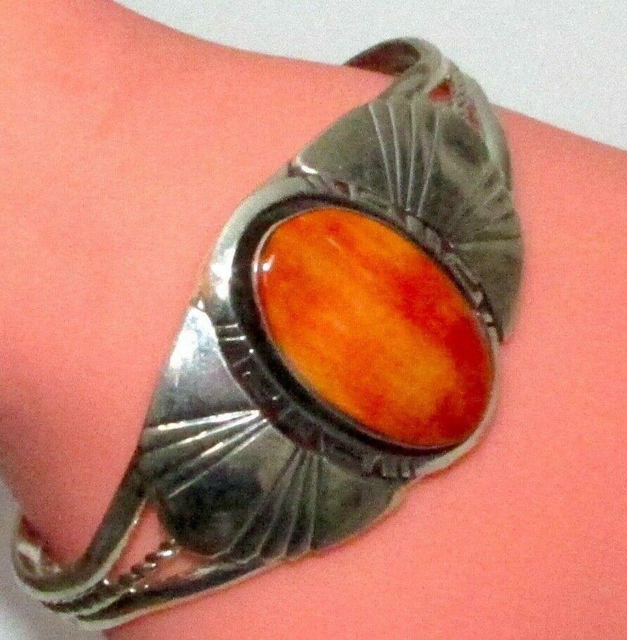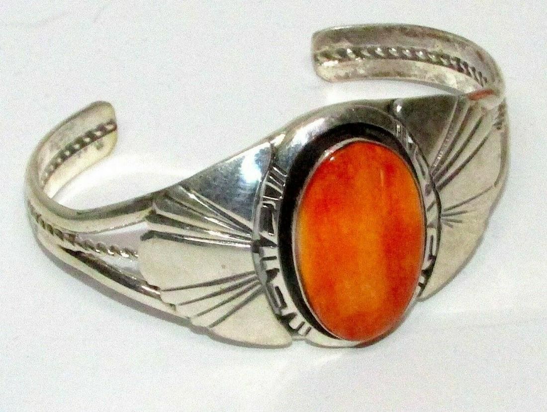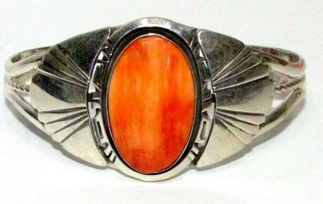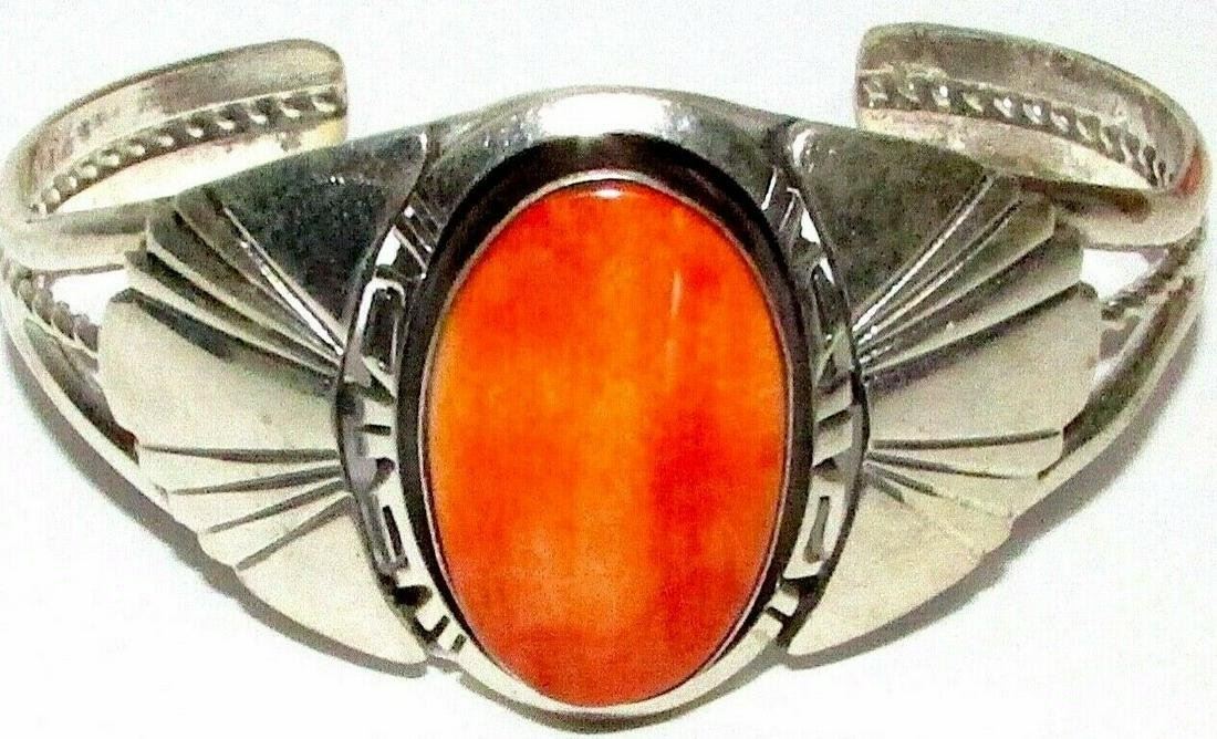 Phenomenal Navajo sturdy sterling silver and gorgeous orange spiny oyster cuff bracelet by the collectible Navajo artist Robert Shakey. Intricately hand etched, traditional Navajo design, accented with a gorgeous, oval orange spiny oyster cabochon. Stamped sterling, signed by the artist, the inside circumference is about 7" including gap, the gap is about 1.5". The cuff can be carefully adjusted. The front of the cuff measures about 1.5" wide at the widest point. The cuff weighs about 30 gr. Fab statement piece to add to any jewelry collection!