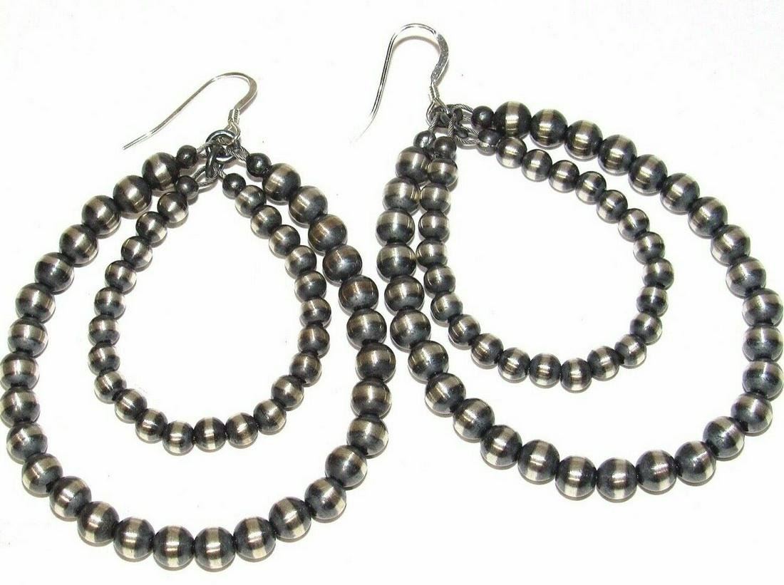 Stunning sterling silver Navajo pearls dangle statement earrings. Sterling silver oxidized beads, graduated beads double loop design with a french hook . Measure about 3" long including hooks. Navajo hand strung and handcrafted. The earrings wear comfortably. Fab examples of wearable Native American art to add to any jewelry collection!
