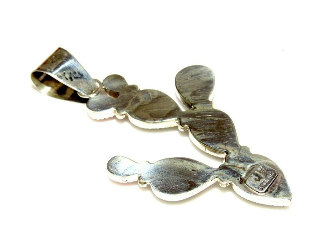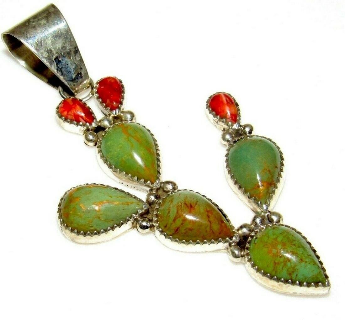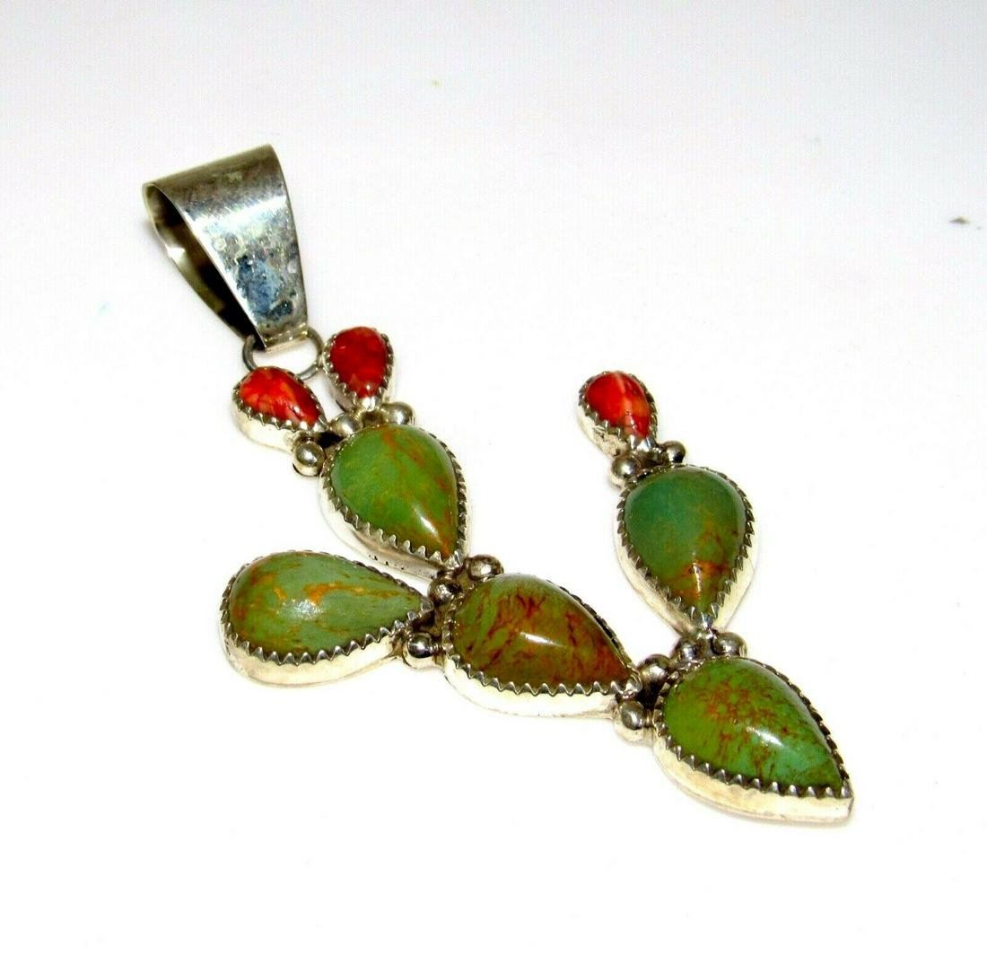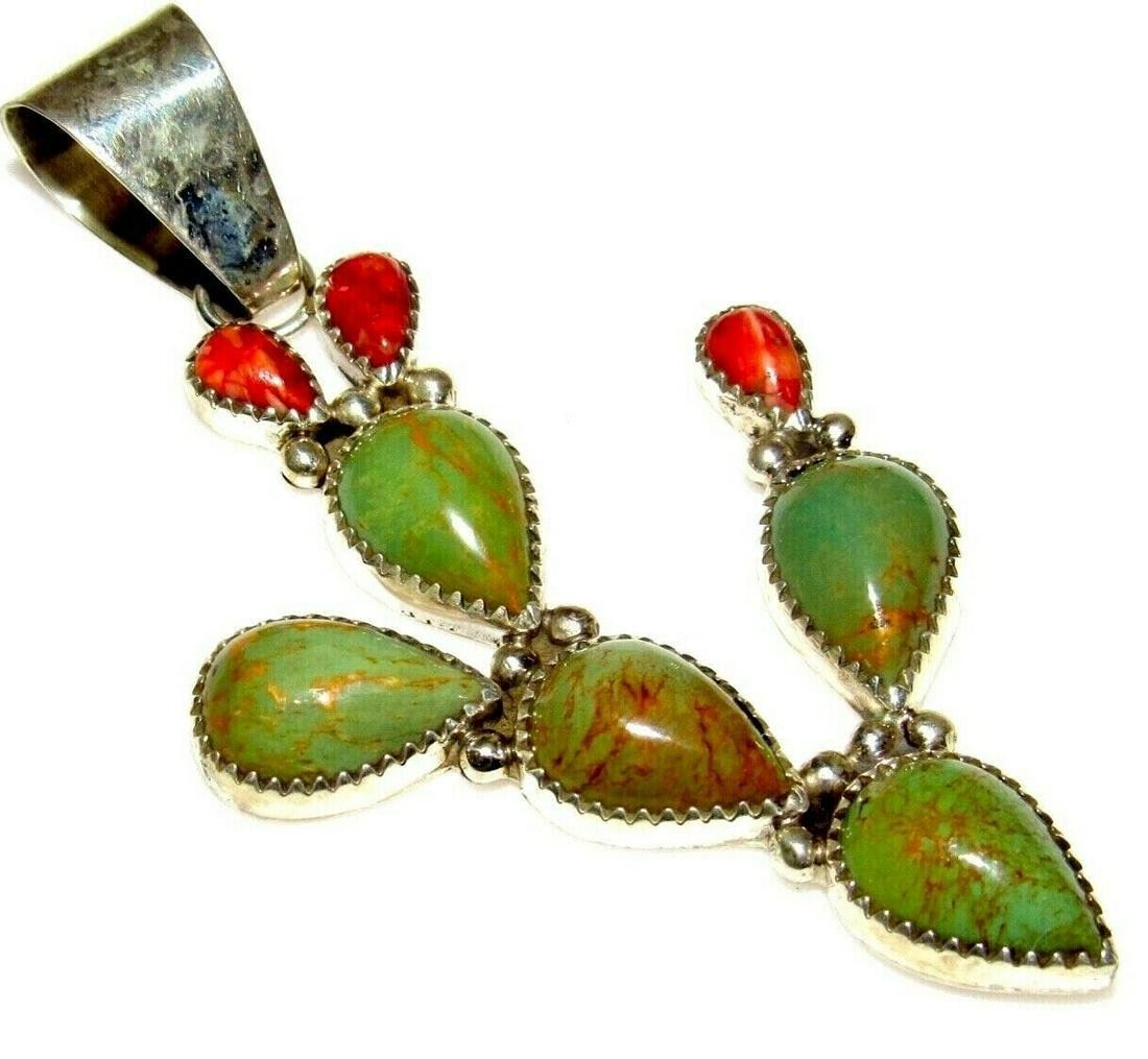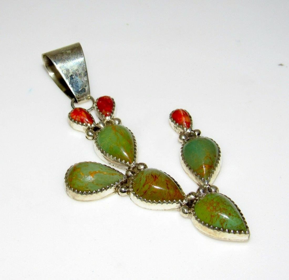 For your consideration is this spectacular Native American Navajo sterling silver, turquoise, and spiny oyster blooming prickly pear cactus pendant. This fabulous pendant features an intricately hand etched symbol of the southwest in sterling silver, accented with gorgeous natural stones. The pendant is signed by the artist and measures about 3" long by a little over 1 1/2" wide at the widest point. Stunning symbol of the southwest hand etched by the Navajo artist to add to any collection!