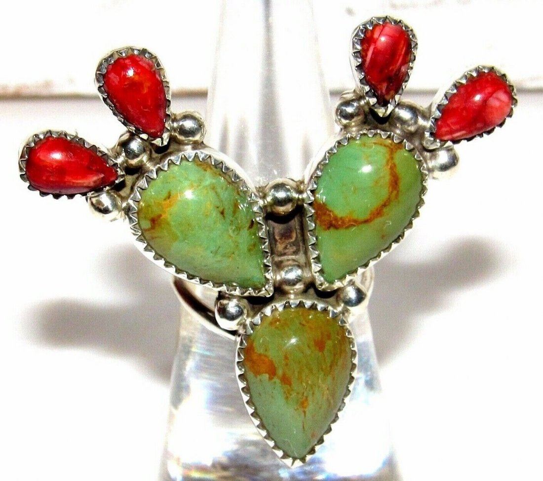 For your consideration is this spectacular Native American Navajo sterling silver, turquoise, and spiny oyster blooming prickly pear cactus ring in ring size 7. This fabulous ring features an intricately hand etched symbol of the southwest in sterling silver, accented with gorgeous natural stones. The ring is signed by the artist. The ring is size 7. The front of the ring measures about 2" wide by about 1 1/2" tall on the front. Stunning symbol of the southwest hand etched by the Navajo artist to add to any collection!
