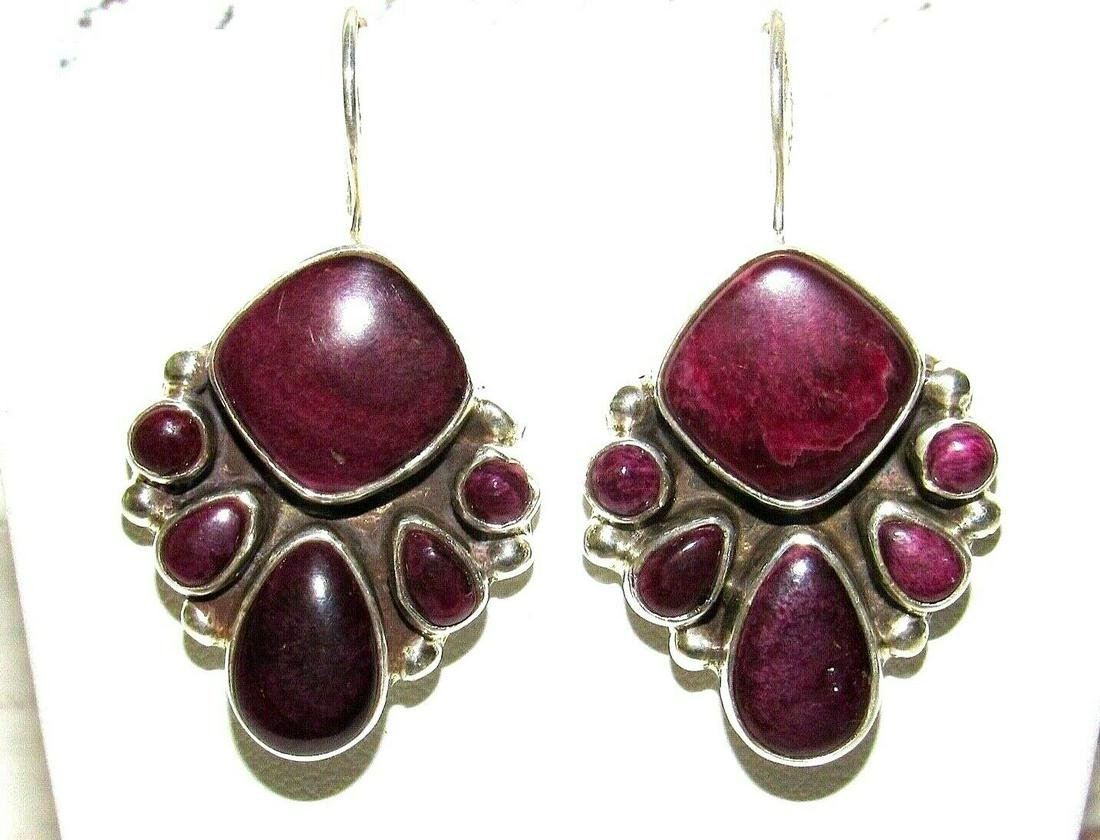 For your consideration is a pair of these gorgeous Navajo sterling silver and gem grade purple spiny oyster cluster statement earrings by the highly collectible Navajo artists Vernon & Clarissa Hale. These wonderful earrings feature an intricately hand etched, cluster design in sterling silver, accented with beautiful, purple spiny oyster cabochons. These beautiful earrings measure about 1 3/4" long by about 3/4" at the widest point. The earrings are signed by the artists and are stamped sterling. Beautiful authentic Native American Navajo earrings to add to any jewelry collection!