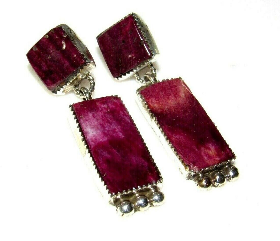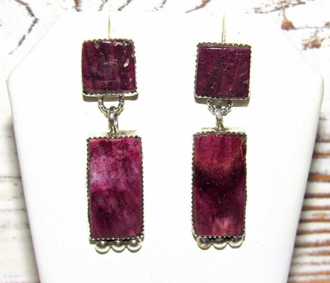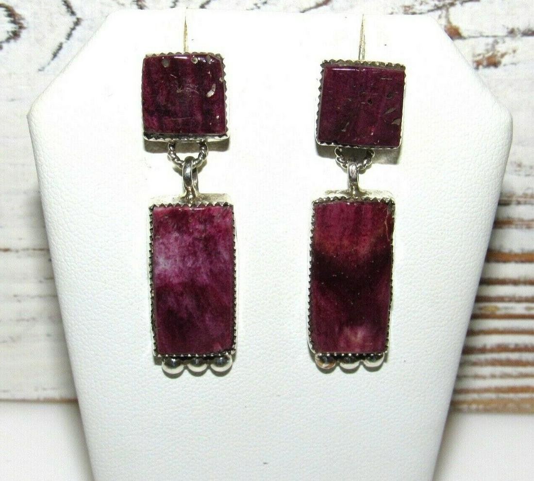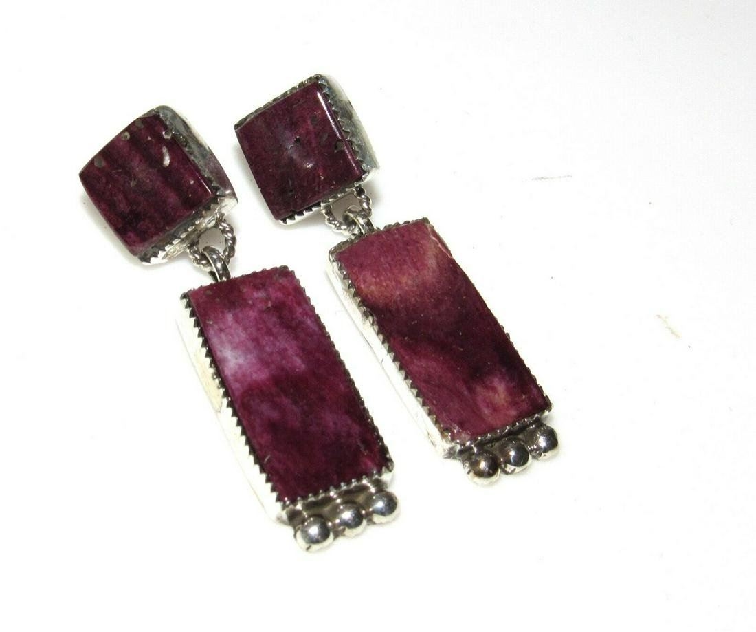 For your consideration is a pair of these fab Navajo sterling silver and purple spiny oyster statement dangle earrings. These wonderful earrings feature a hand etched, geometric design in sterling silver, accented with beautiful, spiny oyster cabochons. These beautiful earrings measure about 1 3/4" long by a little under 3/4" at the widest point. The earrings are signed by the artist and are stamped sterling. Beautiful authentic Native American Navajo earrings to add to any jewelry collection!