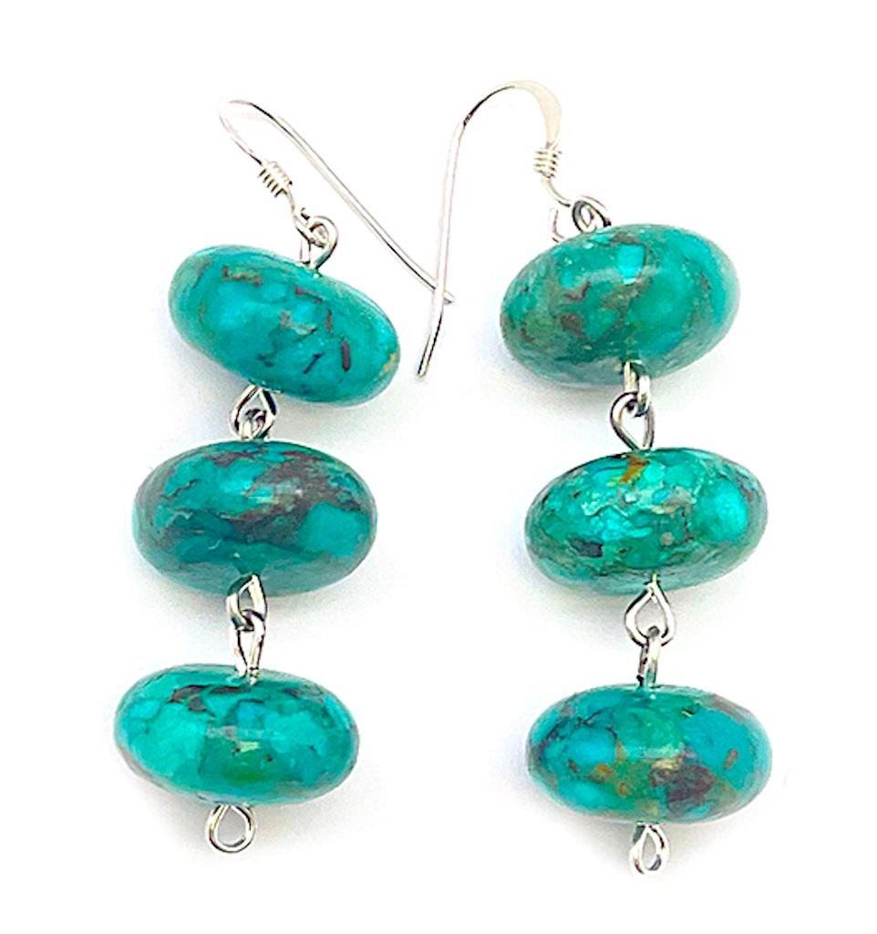 Stunning Navajo rolled turquoise beads and sterling silver heishi earrings by a Navajo artist V. Johnson. The earrings have been hand crafted with 3 polished natural turquoise rondelle style beads with sterling silver accented and sterling silver french hooks. The earrings are lever back type and measure about 2" long by about 5/8" wide. Gorgeous, elegant pieces that are sure to complement any outfit.