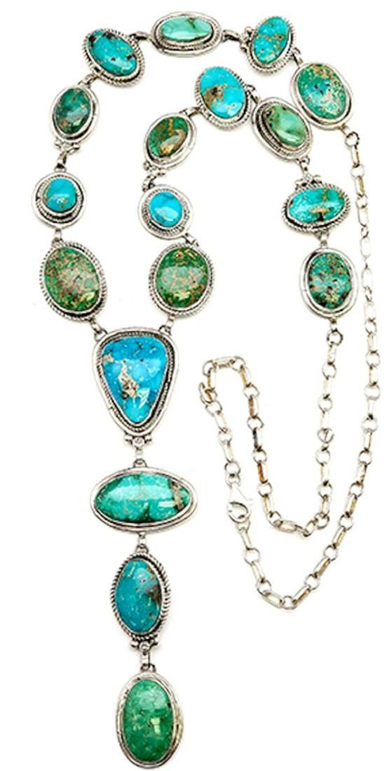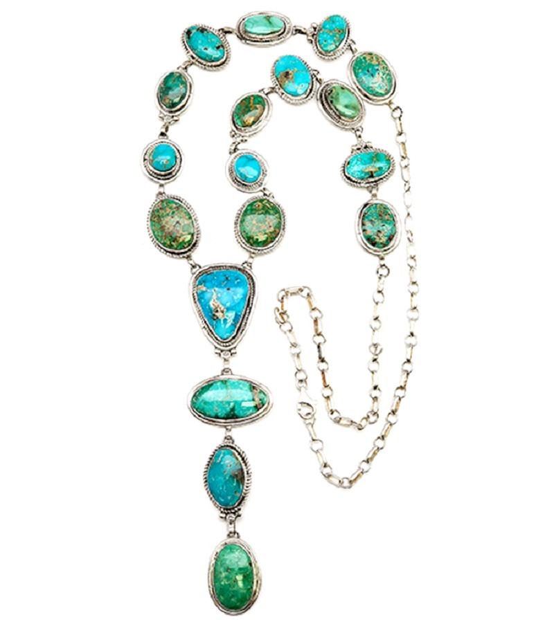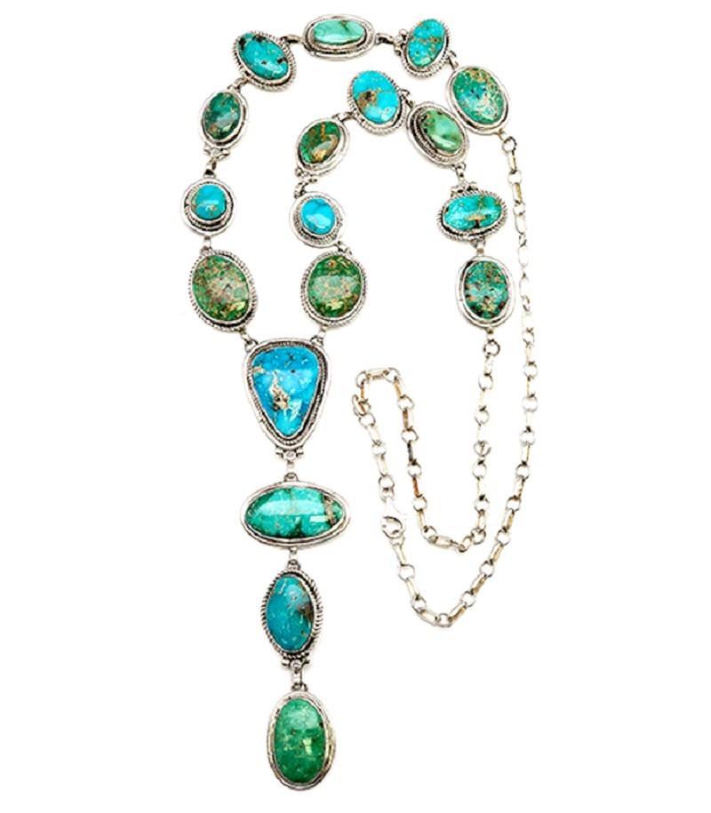 Stunning Native American Navajo sterling silver and Royston turquoise lariat necklace by the collectible Navajo artist Kree Blanchard. Hand etched lariat sterling silver necklace, accented with a gorgeous Royston turquoise cabochons in shades of green and blue. This stunning necklace measures impressive 30" long. The center pendant dangle part of the lariat necklace measures approximately 4 3/4" long by 7/8" at widest. The necklace weighs about 109 Gr. Hallmarked by the artist and stamped "sterling". The variety of Royston turquoise shades on the necklace make it versatile and will complement a variety of turquoise earrings and rings. Fantastic authentic Native American lariat necklace to add to any jewelry collection!