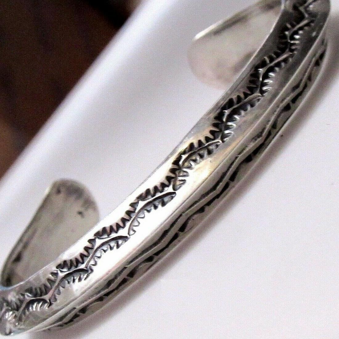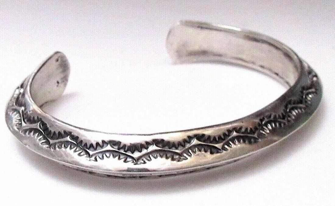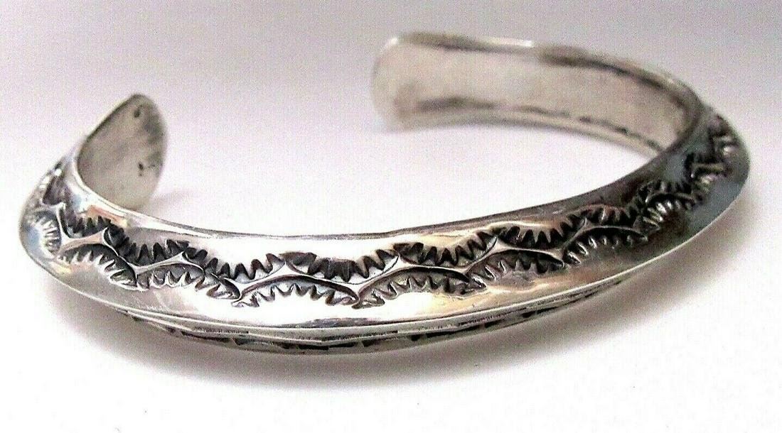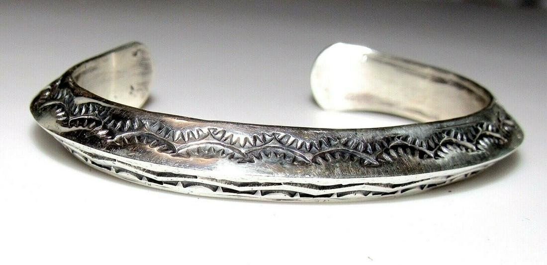Phenomenal, heavy gauge sterling silver Native American Navajo intricately hand stamped, double sided cuff bracelet by the highly collectible, award winning Navajo artist Sunshine Reeves. Exceptional craftsmanship and attention to detail, intricately hand stamped tribal design. Features various water elements on each side. The inside circumference is about 6 3/4" including the gap. The gap is about 1 1/4". Weighs about 43 G. Stamped sterling, signed by the artist. Exceptional example of wearable Native American art to add to any jewelry collection.