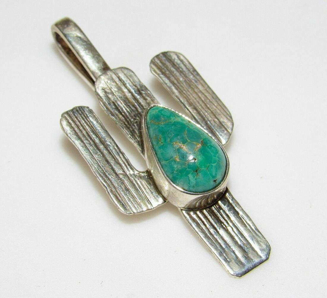 For your consideration is this spectacular Native American Navajo sterling silver and turquoise saguaro cactus pendant by the collectible Adam Fierro. This fabulous pendant features an intricately hand etched symbol of the southwest in sterling silver, accented with gorgeous Royston turquoise stone. The pendant is signed by the artist and measures about 2 1/4" long including the bail by about 1" wide at the widest point. Stunning symbol of the southwest hand etched by the Navajo artist to add to any collection!