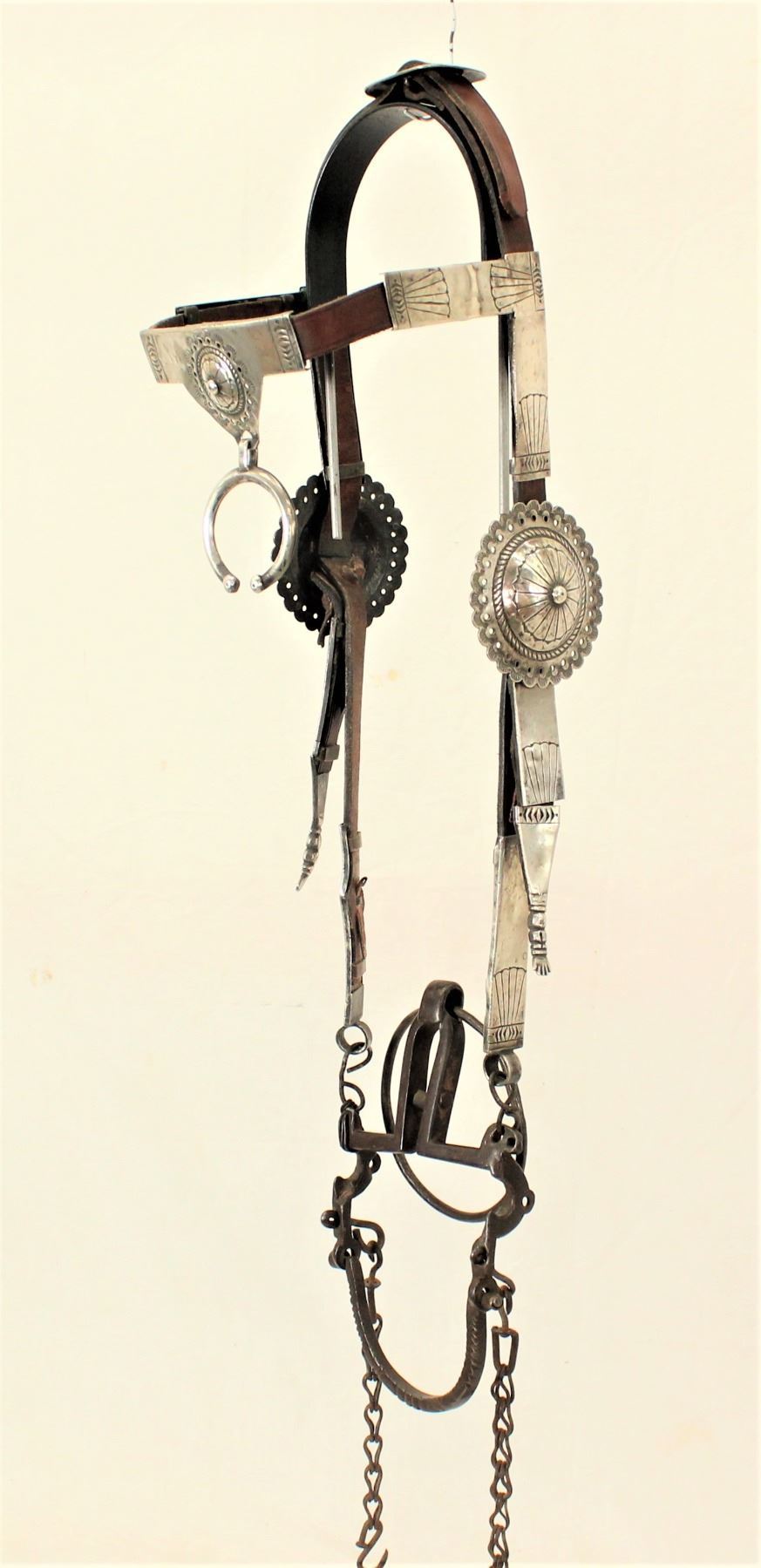 Very special turn of the Century Native American headstall, completely mounted in beautifully engraved sterling silver, with striking cheekpeice medallions, and fitting original iron Navajo ring bit.