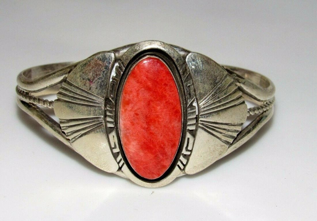 Phenomenal Navajo substantial sterling silver and gorgeous red spiny oyster cuff bracelet. Intricately hand etched, traditional Navajo design, accented with a gorgeous, oval red spiny oyster cabochon. Stamped sterling, signed by the artist, the inside circumference is about 7" including gap, the gap is about 1.5". The cuff can be carefully adjusted. The front of the cuff measures about 1.5" wide at the widest point. The cuff weighs about 30 gr. Fab statement piece to add to any jewelry collection!