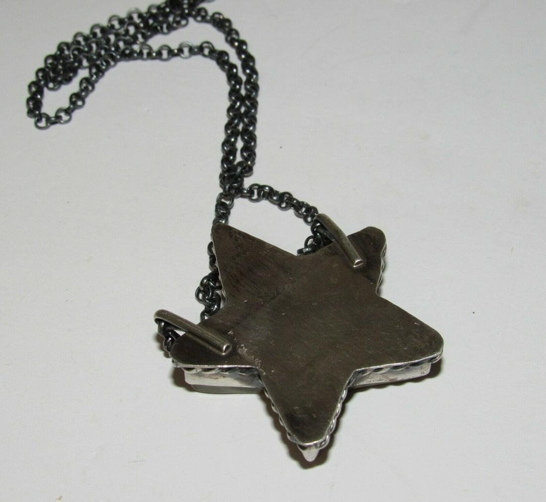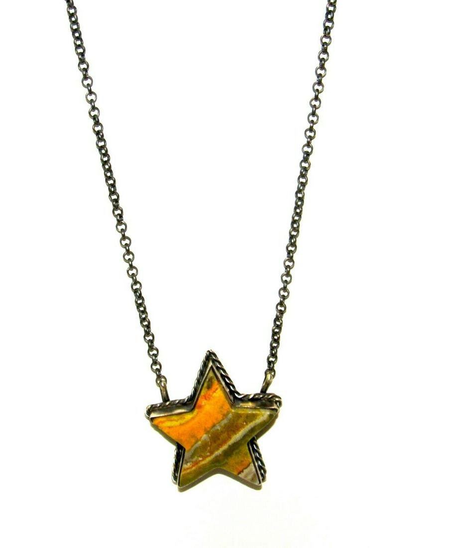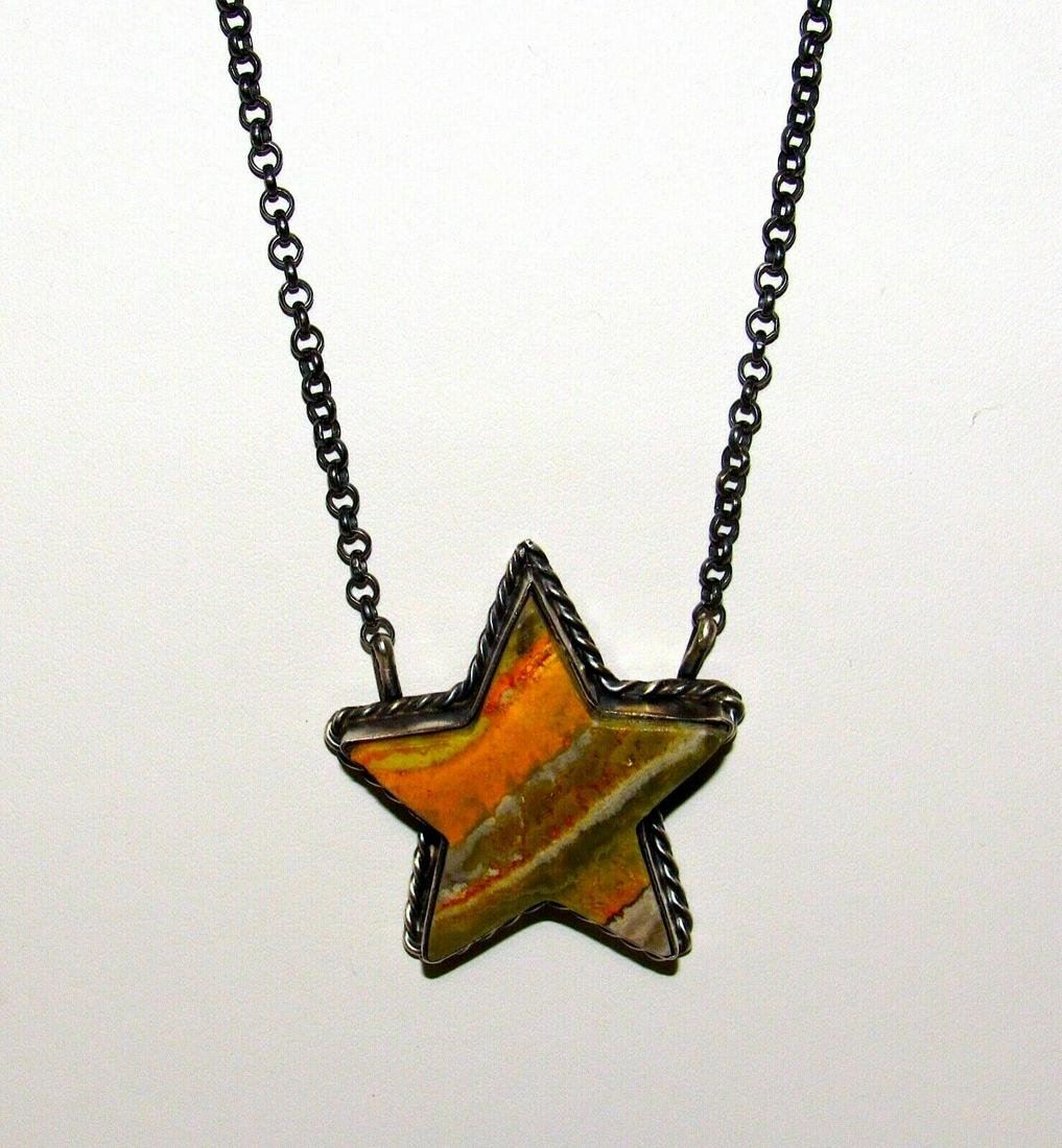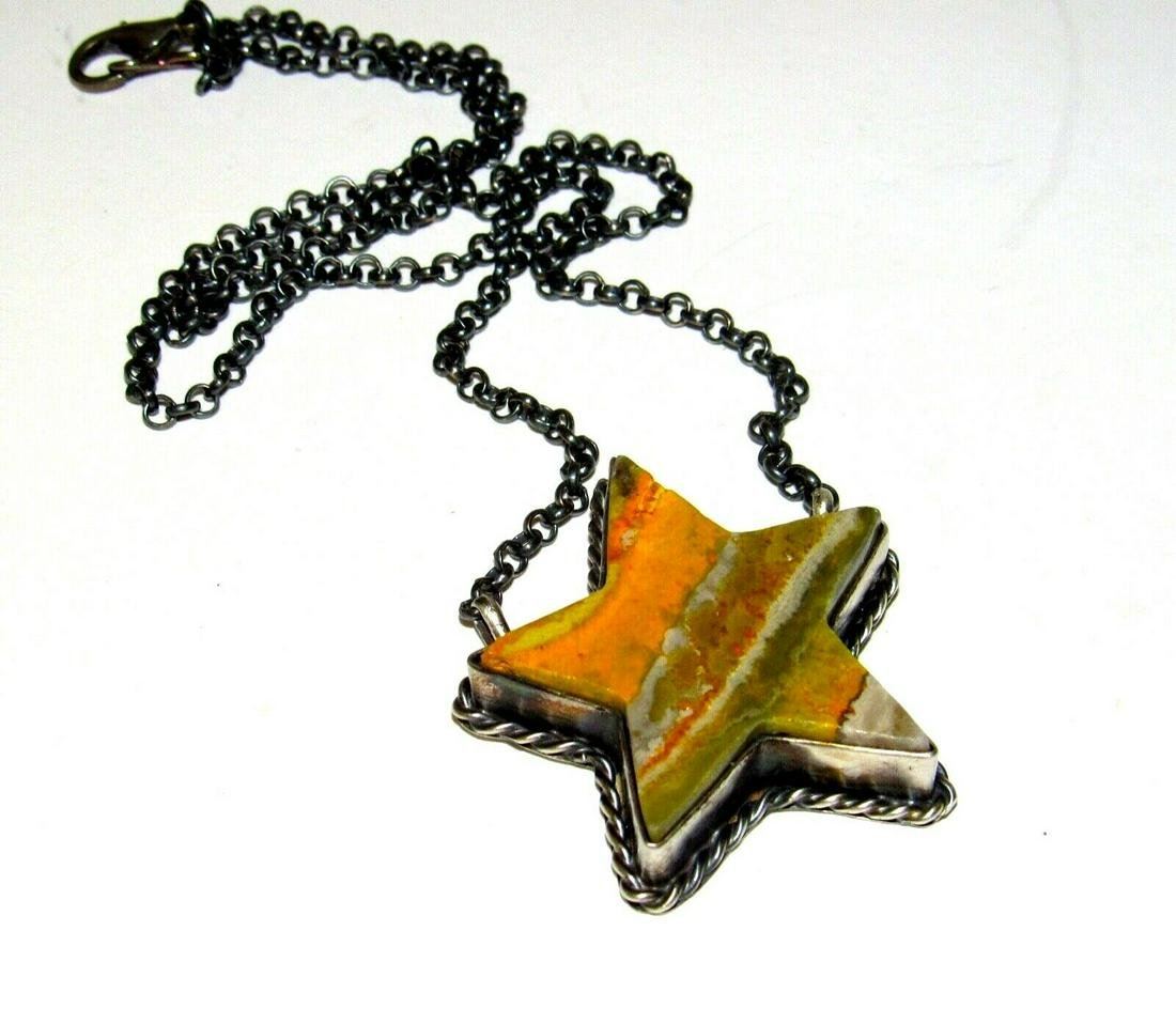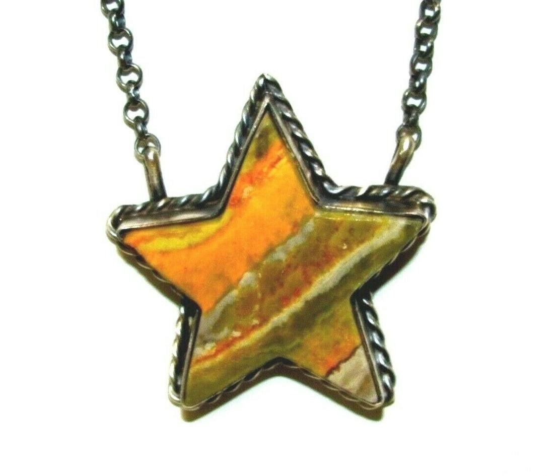 Calling all superstars! For your consideration is this phenomenal Navajo sterling silver and bumblebee jasper star bar necklace. The necklace is about 21" long and the length is adjustable from choker to full length. The necklace features a gorgeous star bar pendant and a nice sterling silver chain with oxidizes silver finish. The bumblebee jasper star pendant measures about 1 3/4" wide by about 1 1/2" long. Created by M. House and comes directly from the artist's collection. Gorgeous stone, sterling chain necklace. Fab Native statement necklace.