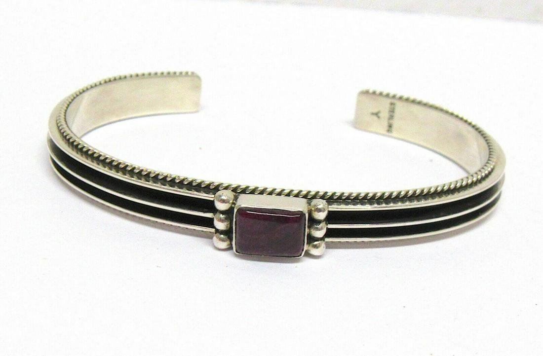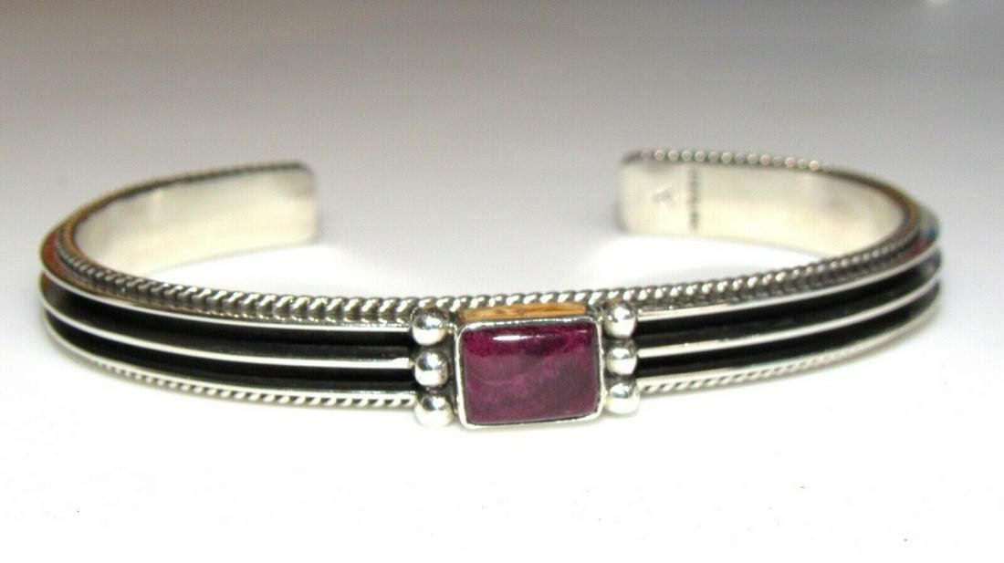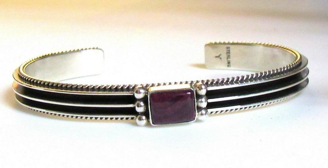 Stunning Native American Navajo sterling silver and purple spiny oyster cuff bracelet by the Navajo artist D. Yazzie. The inside circumference is about 6.5" including the gap. The gap is about 1", the cuff is carefully adjustable. Signed, marked, tested. Great as a stacker or statement piece