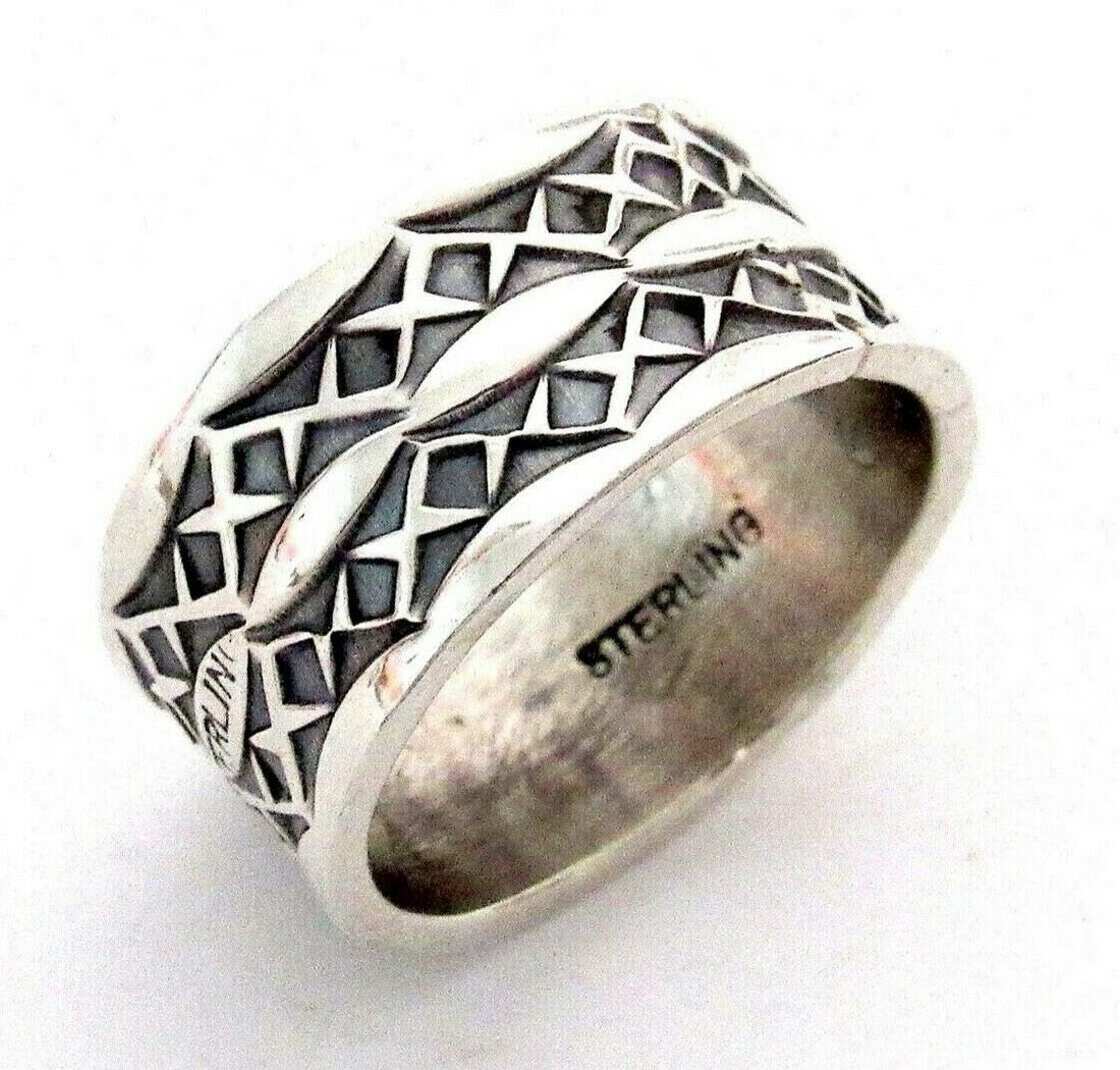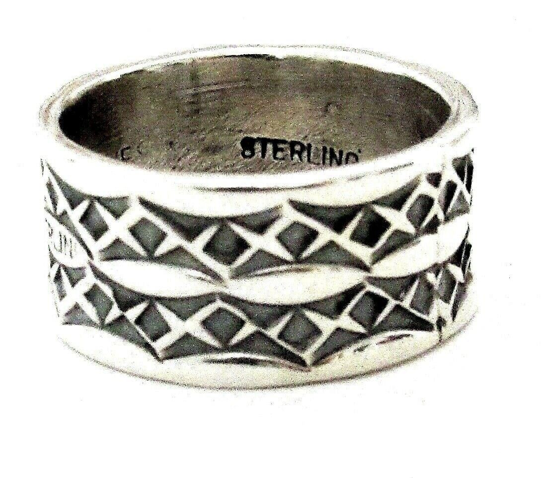 Wonderful Native American Navajo sterling silver intricately hand stamped band ring with tribal design by the highly collectible, award winning Navajo artist Sunshine Reeves. Exceptional craftsmanship and attention to detail, intricately hand stamped tribal design. The ring is size 8. Measures about 1/2" wide. Stamped sterling, signed by the artist on the inside and outside. Exceptional example of wearable Native American art to add to any jewelry collection.