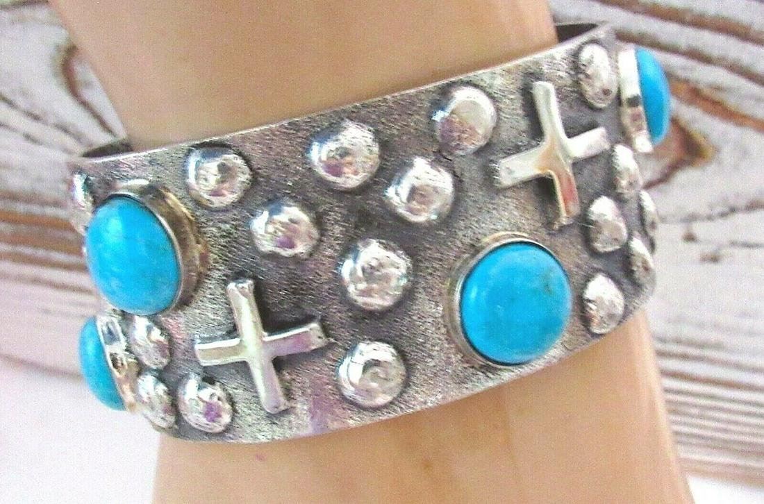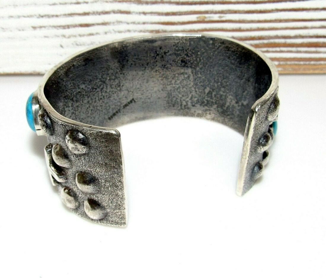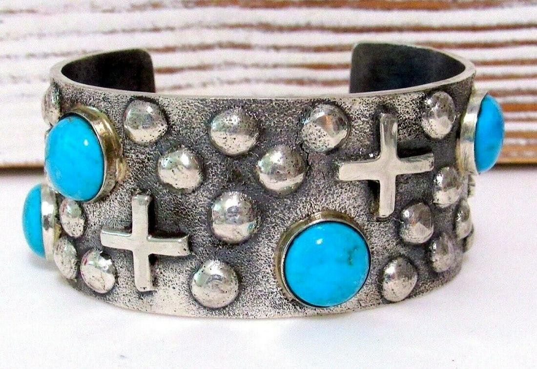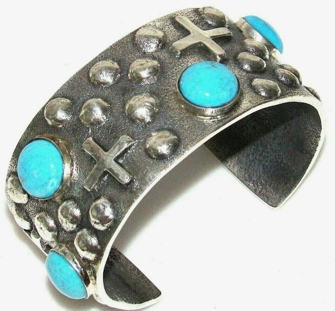 Spectacular Massive Navajo Lester James sterling silver & Sleeping Beauty mine turquoise tufa cast statement cuff bracelet. Intricately hand etched cross design in sterling silver all around, accented with 4 Sleeping Beauty mine cabochons. The cuff impressively weighs about 110 gr. The inside circumference is about 6 1/2” including gap, the gap is about 1 1/4". The front measures a little under 1 1/2" wide at the widest point. Singed, marked, tested. Exceptional craftsmanship and attention to detail. Award winning, highly collectible and sought-after Navajo artist!