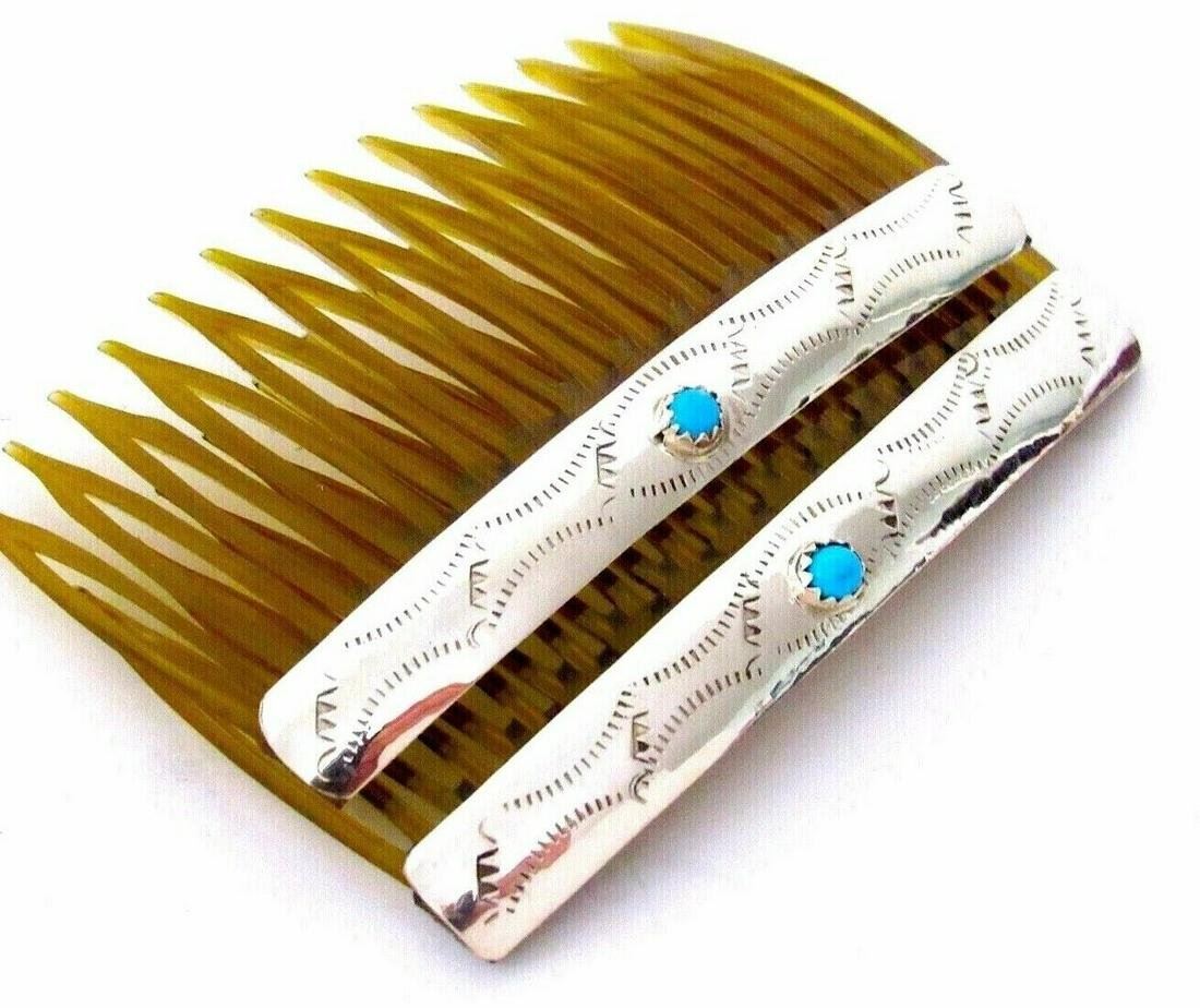 A set of 2 Navajo Sterling silver and turquoise combs. Detailed, hand stamped design in sterling, accented with a Sleeping Beauty mine cabochon each. The combs measure a little under 3" wide. New, never used condition. Fab example of wearable, collectible Native American art to add to any jewelry collection!