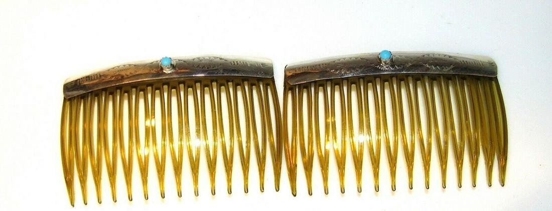 Navajo Turquoise Hair Combs Pair Sterling Silver Native