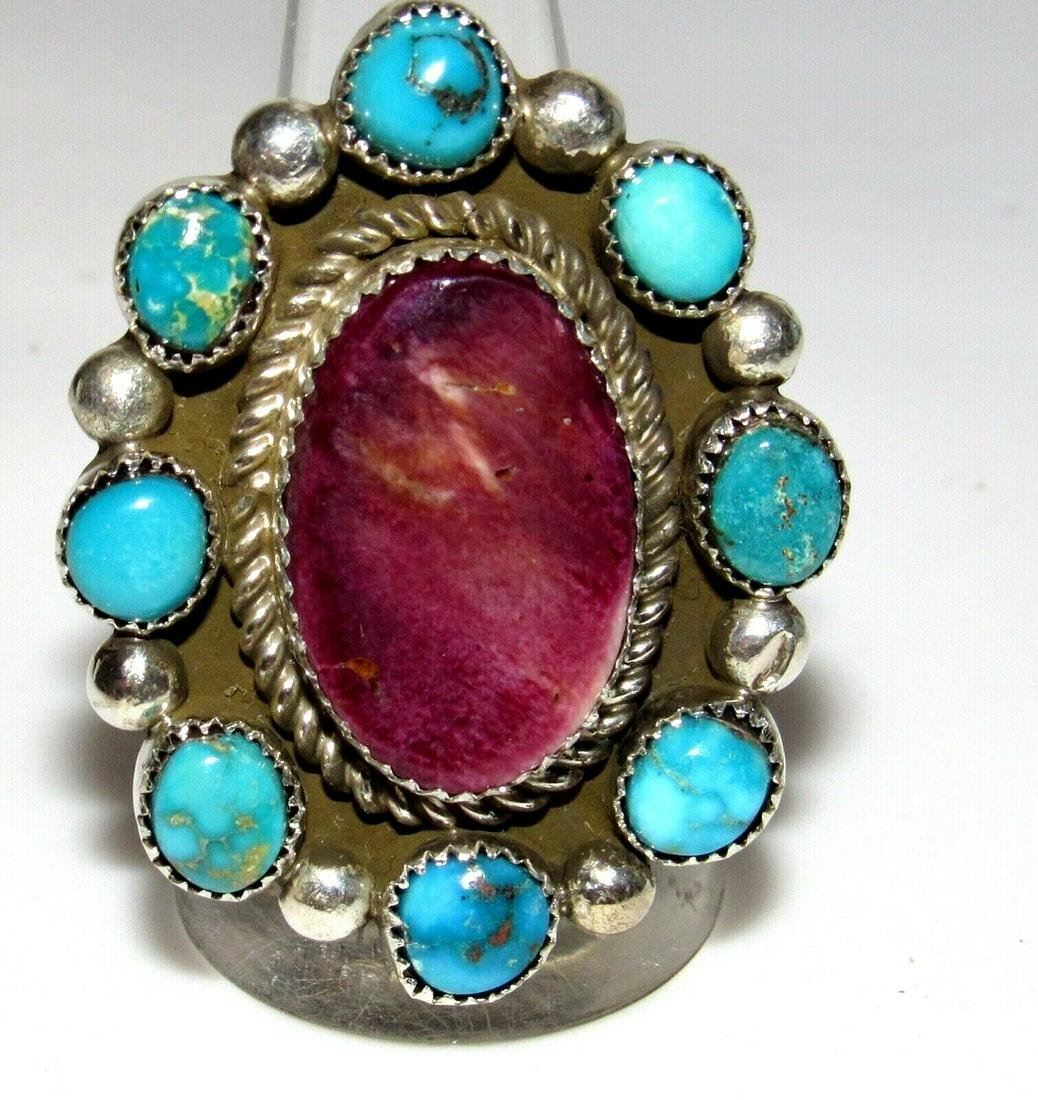 For your consideration is this spectacular Native American Navajo sterling silver , Kingman turquoise and purple spiny oyster cluster ring size 9 by C. Etsitty. This fabulous ring features a traditional Navajo cluster design of a stunning, natural purple spiny oyster in the center and natural Kingman turquoise cabochons all around. The ring is signed by the artist and is stamped sterling on the back. The ring is size 9. The front of the ring measures a littler under 1 1/4" tall. Stunning example of wearable Native American art to add to any collection!