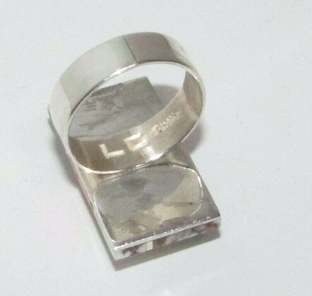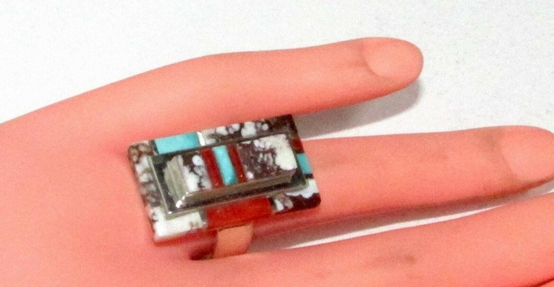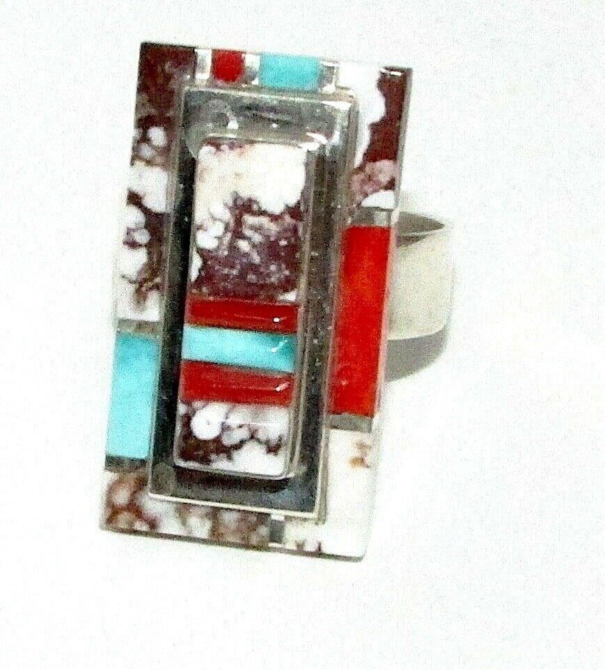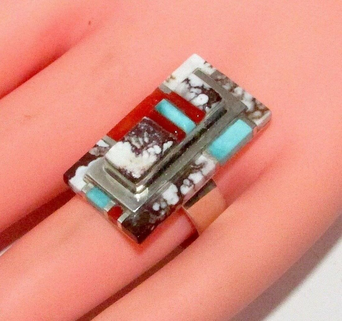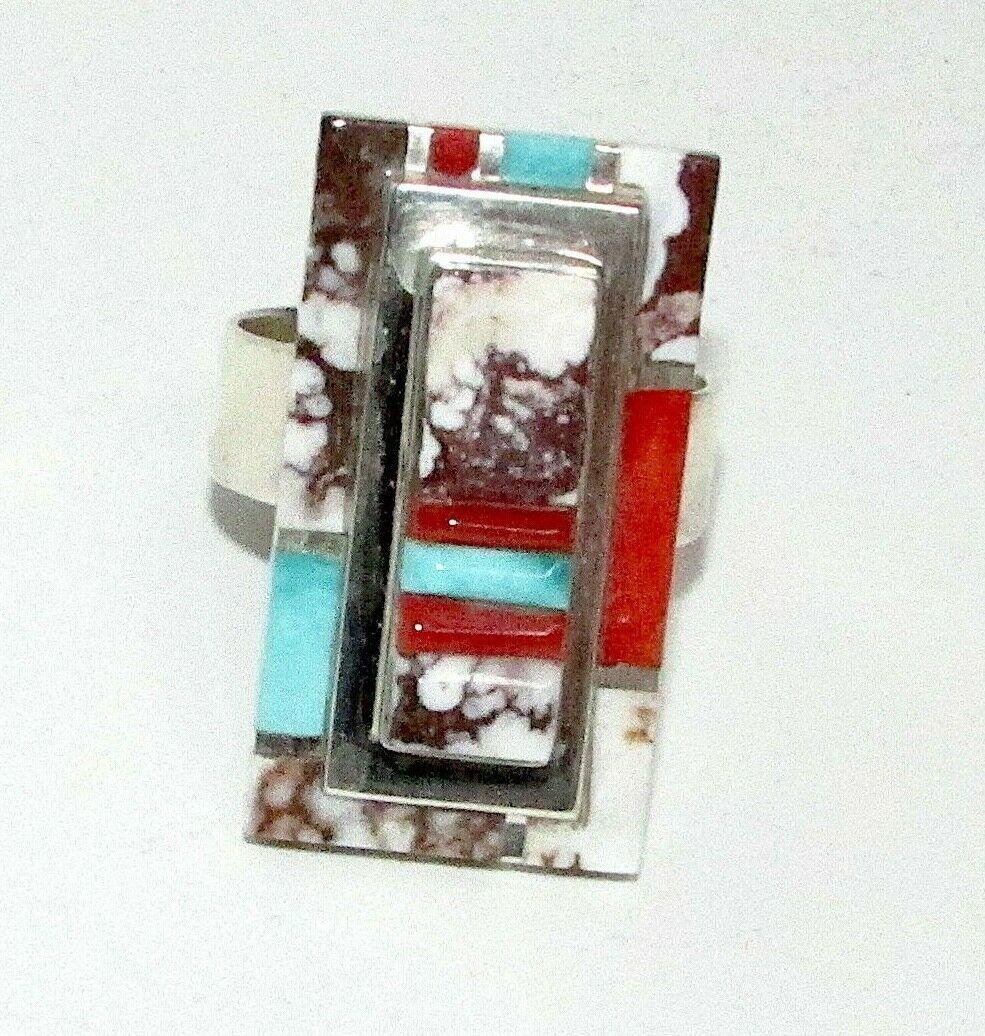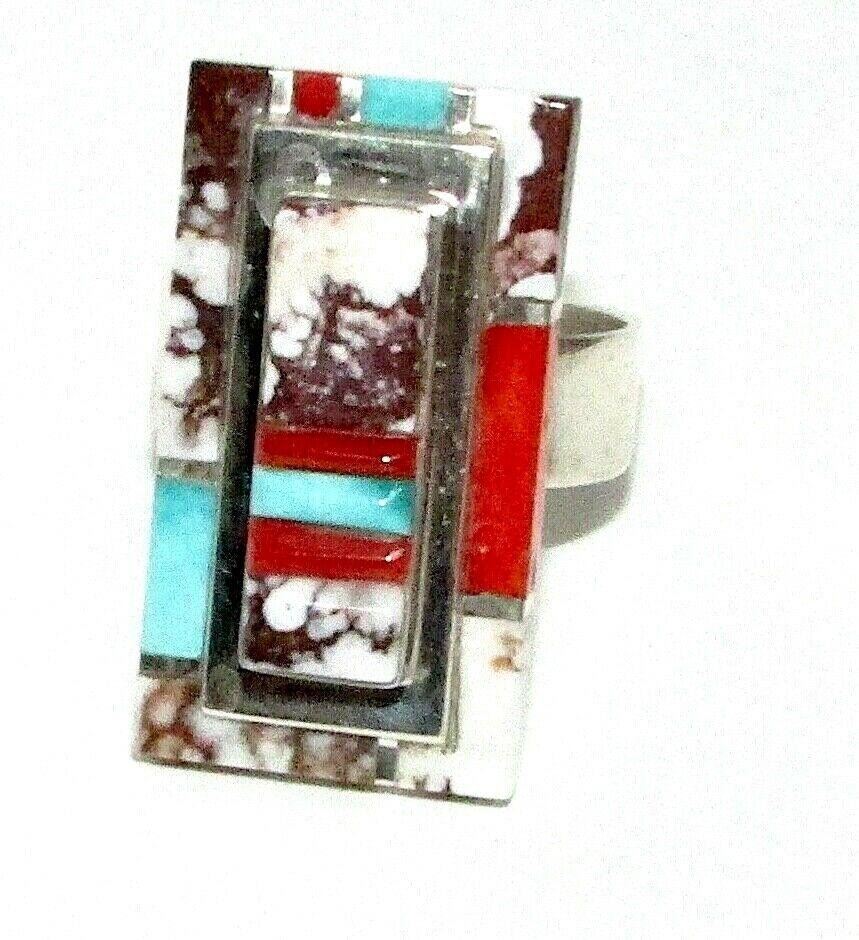 Phenomenal Navajo sterling silver and gorgeous White Buffalo, Number 8 turquoise, and coral cobble stone inlay statement ring in size 8. Marked sterling and is signed by the artist. Stunning example of Native American hand crafted, wearable art to add to any jewelry collection. Fab statement example of wearable Native American art.