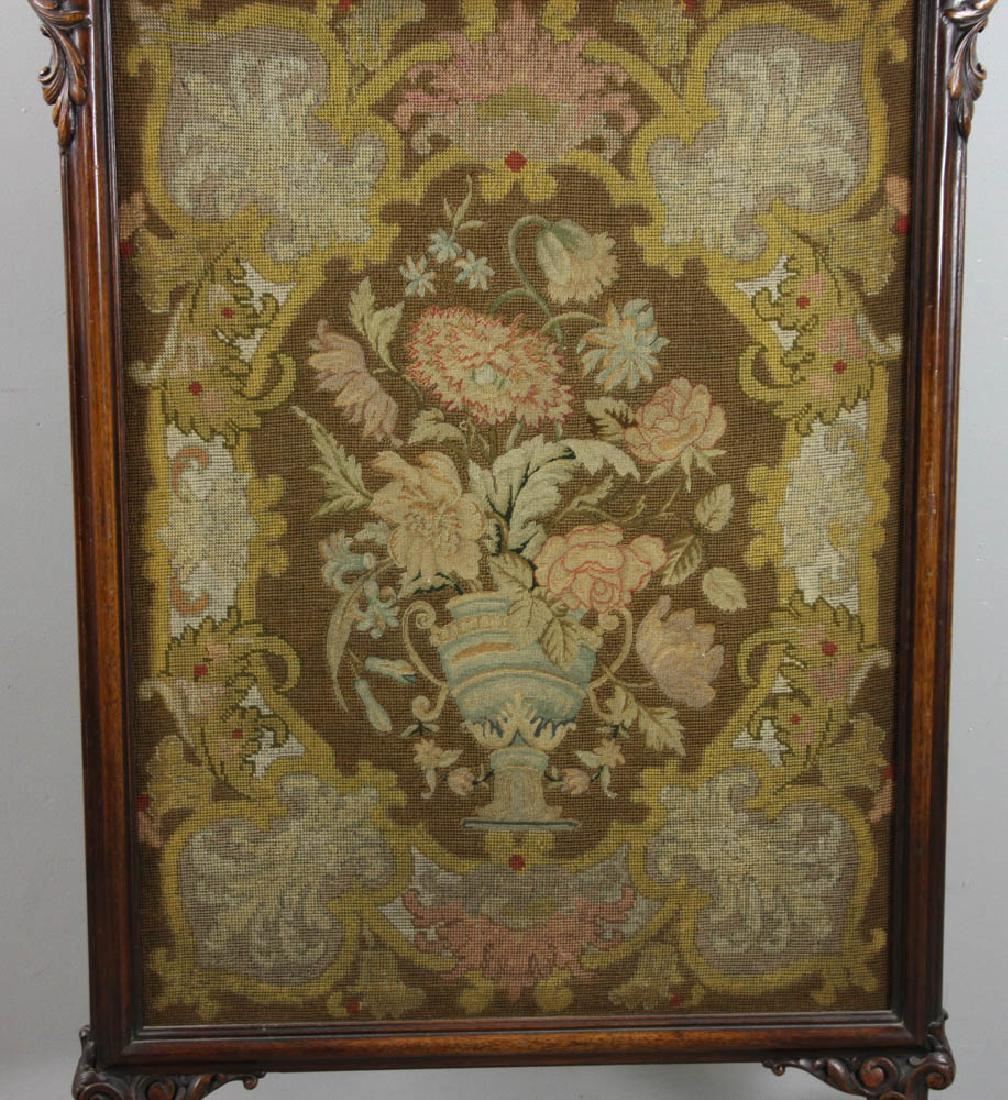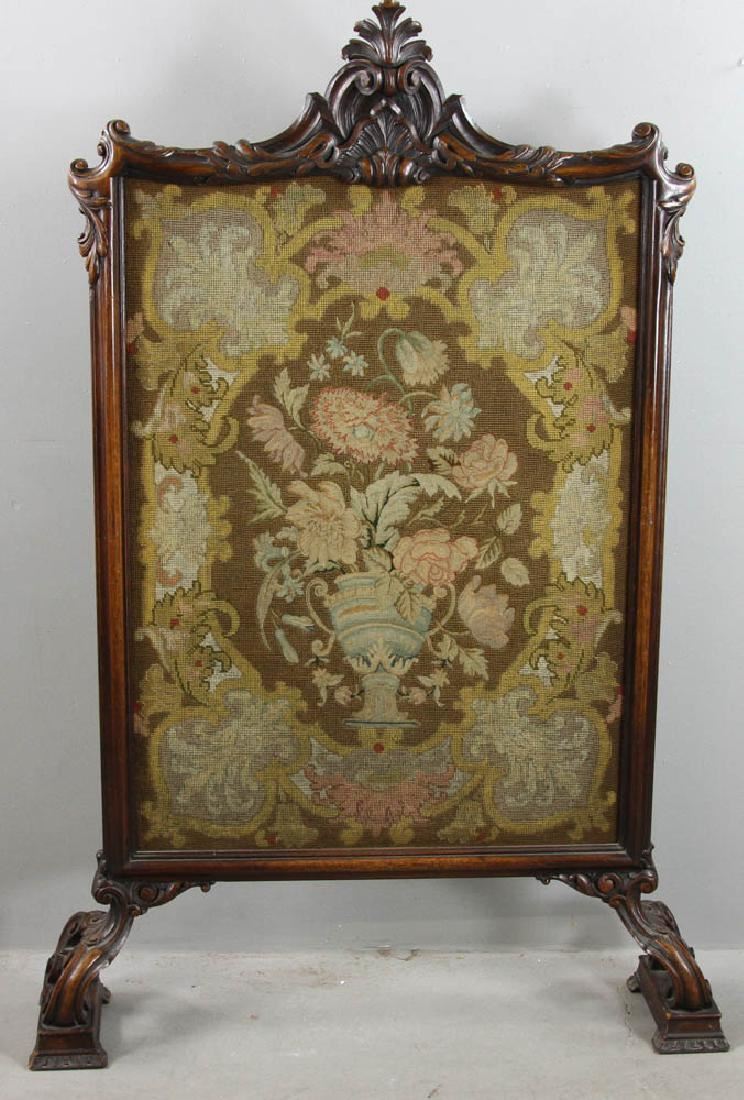 Needlepoint firescreen in carved mahogany frame, 53" H x 36" W. Provenance: Gretna, Louisiana estate.