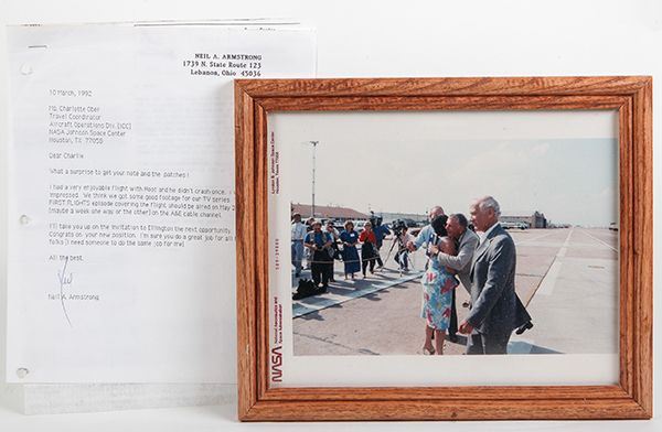 Neil Armstrong Autograph - Signed "Neil". Another fun letter written by "Neil" to his former NASA coworker. Neil writes, "I had a very enjoyable flight with HOOT and he didn't crash once. I was impressed". Attached is a copy of a letter the consignor sent to Neil to which he was responding. That letter makes note of a photo taken of Neil hugging the consignor - that photo is also included.