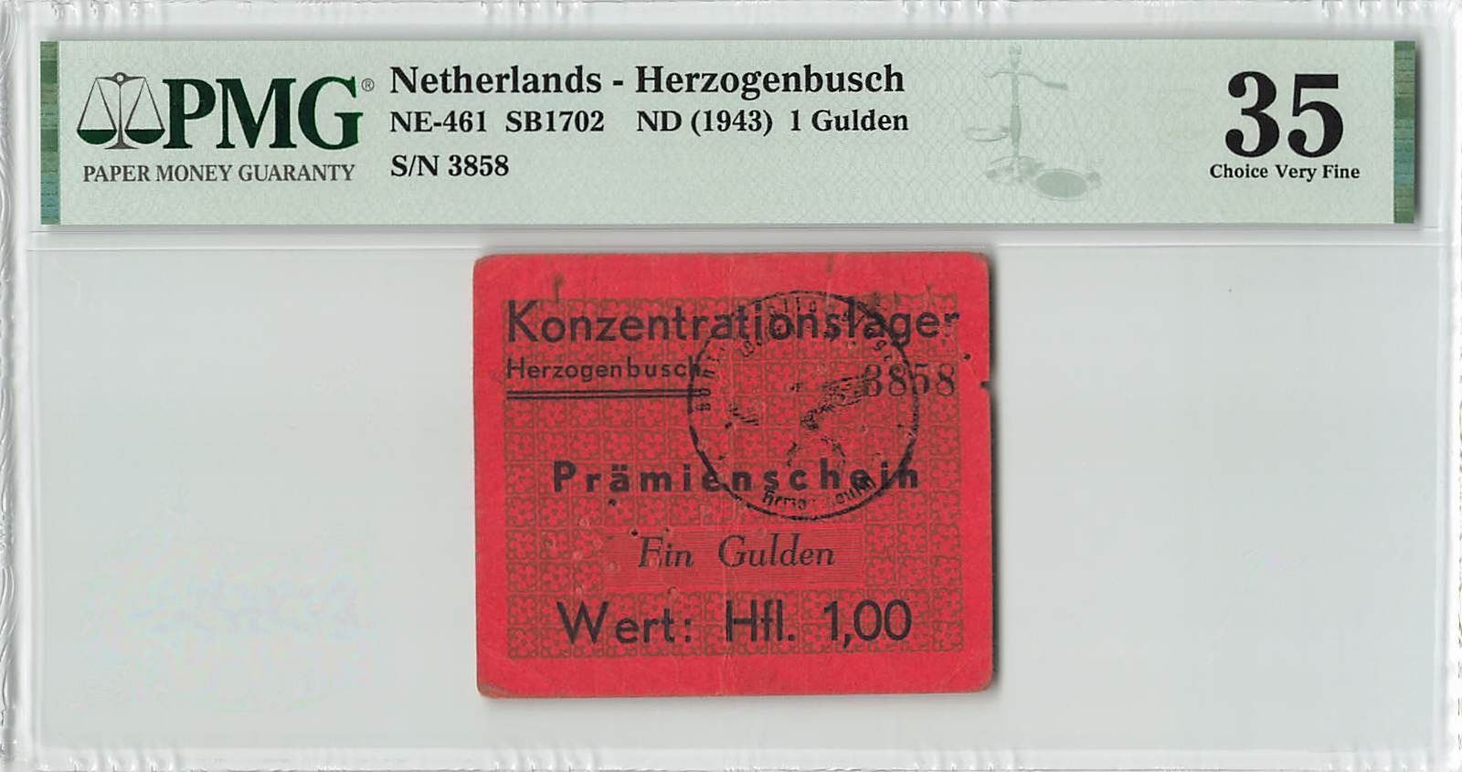 Netherlands 1 Gulden 1943 Herzogenbusch Konzentrationslager Pramienschein Concentration Camp NE-461 PMG Choice Very Fine 35