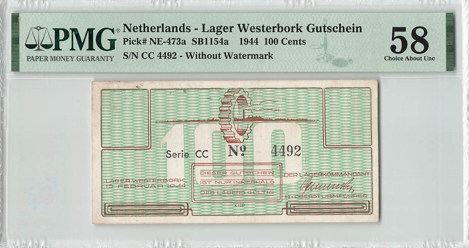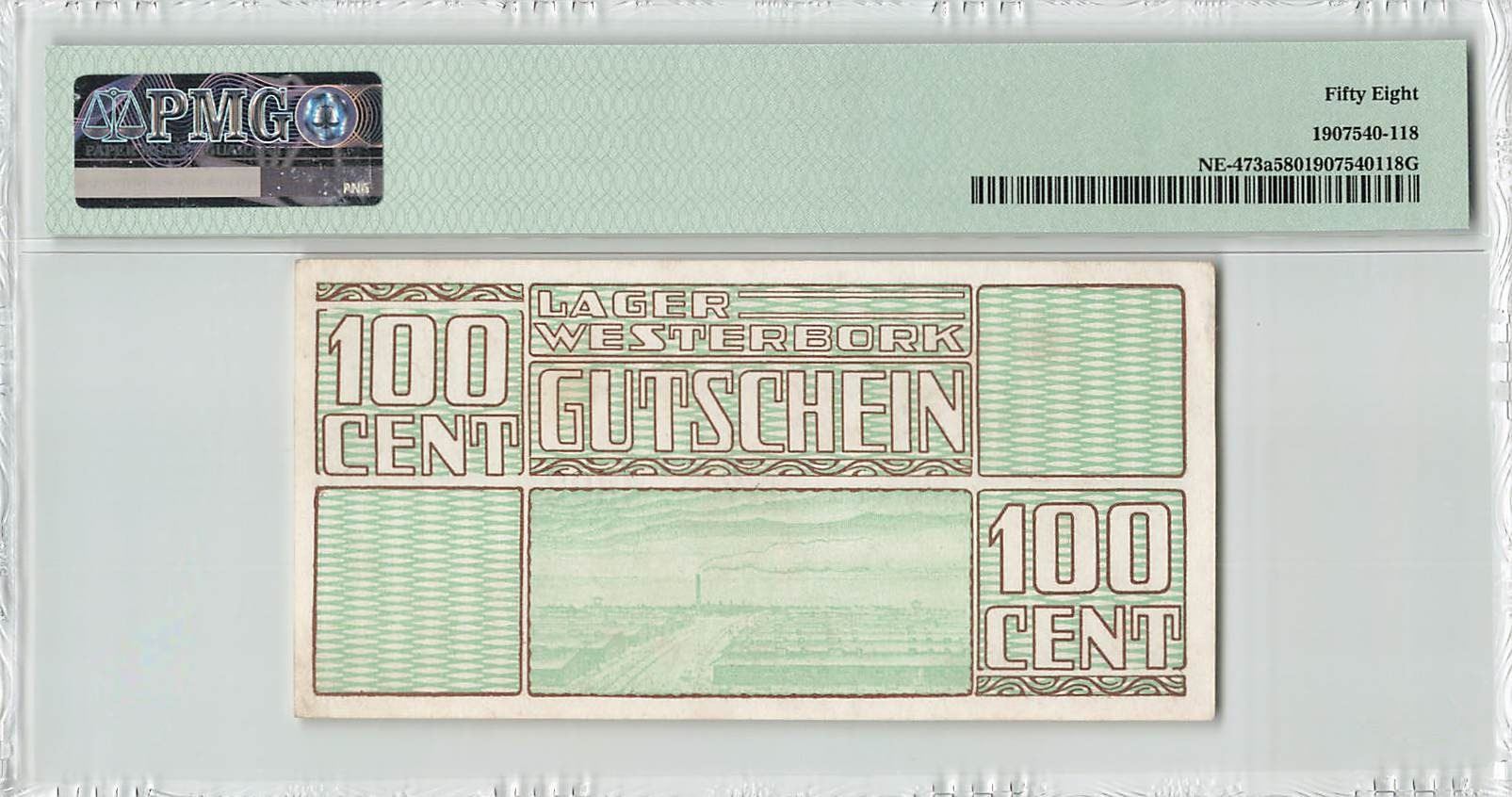 Netherlands 100 Cents 1944 CC w/o Watermark Lager Westerbork Gutschein (transit camp to concentration camps) PMG Choice About UNC 58