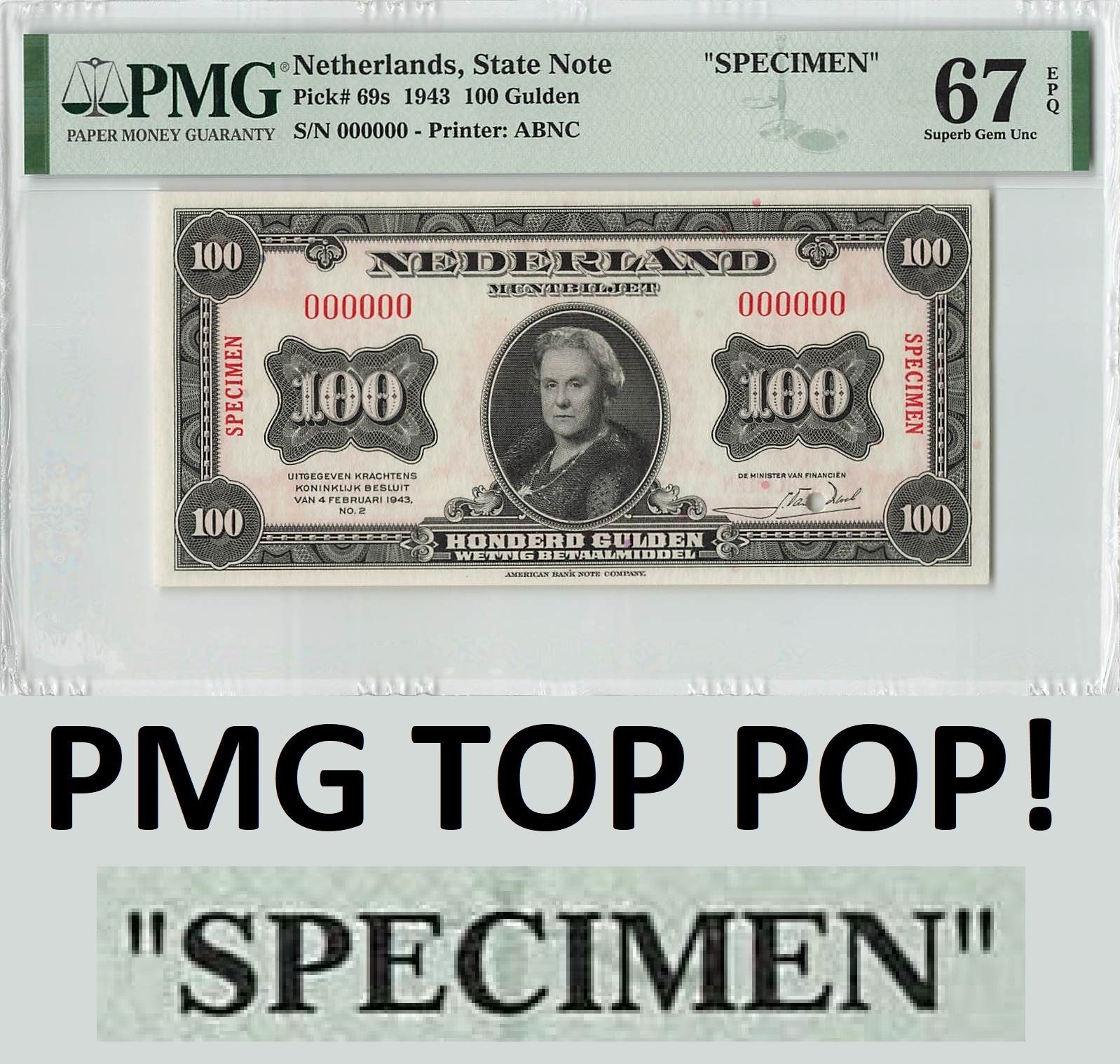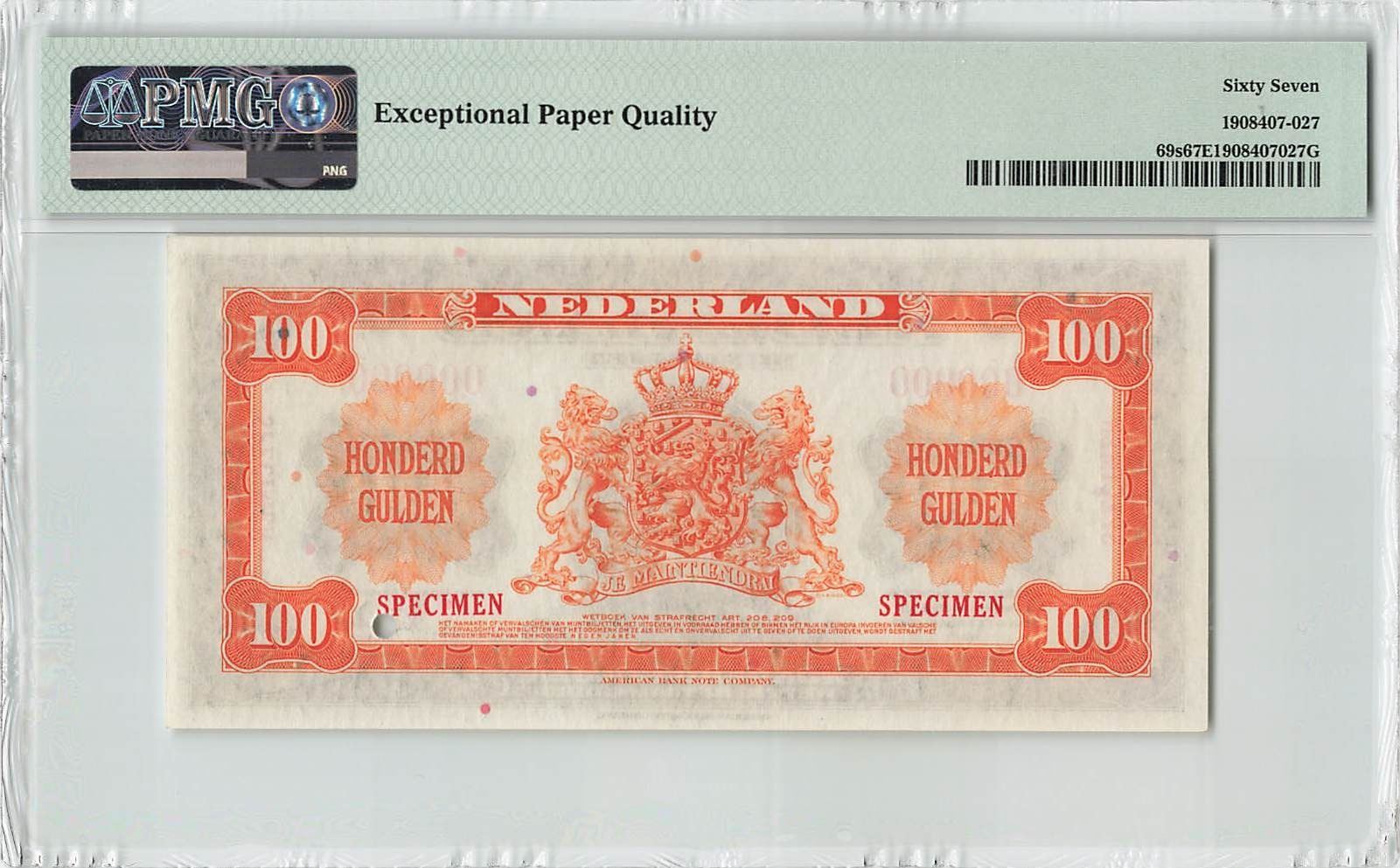 Netherlands 100 Gulden 1943 Specimen State Note ABNC Pick 69s PMG Superb Gem UNC 67 EPQ TOP POP