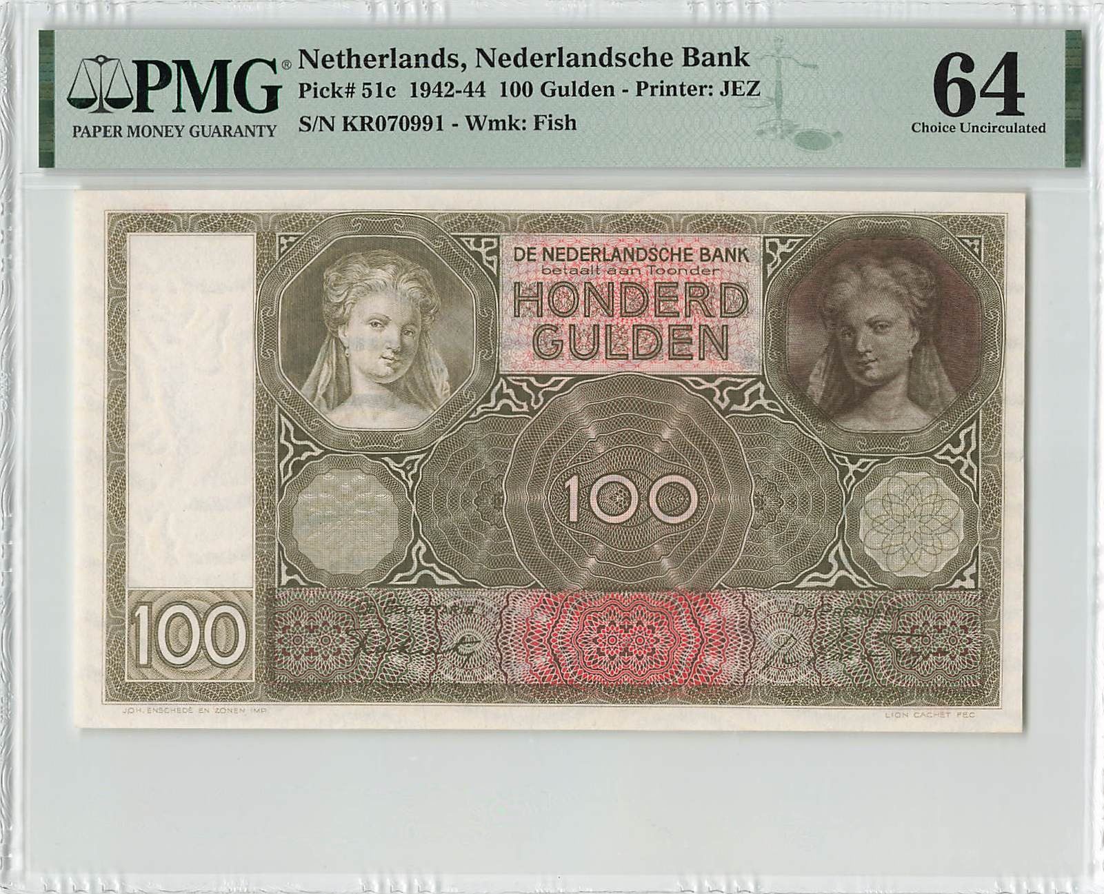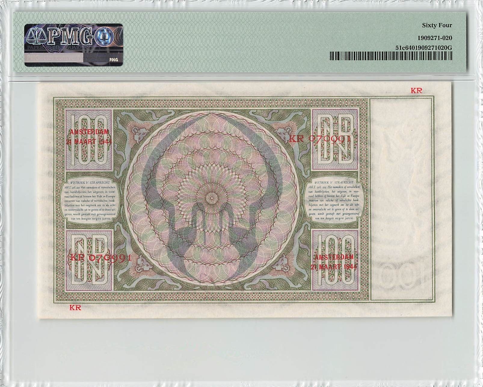 Netherlands 100 Gulden 1944 JEZ Pick 51c PMG Choice Uncirculated 64