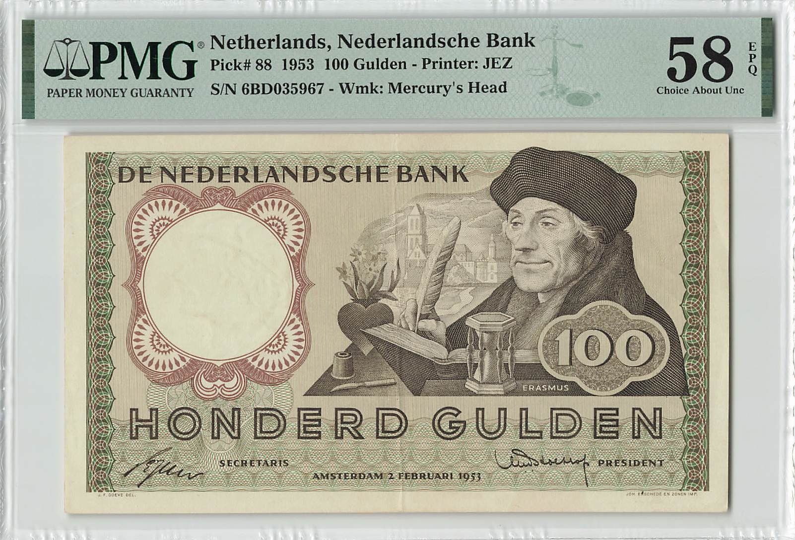 Netherlands 100 Gulden 1953 Erasmus Pick 88 PMG Choice About UNC 58 EPQ