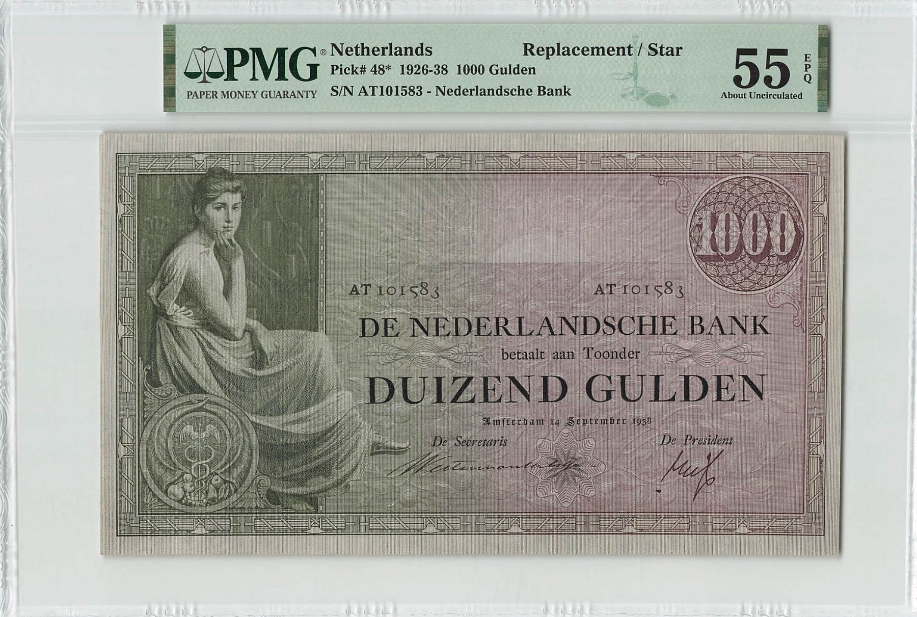 Netherlands 1000 Gulden 1938 Replacement Grietje Seel Pick 48 PMG About Uncirculated 55 EPQ