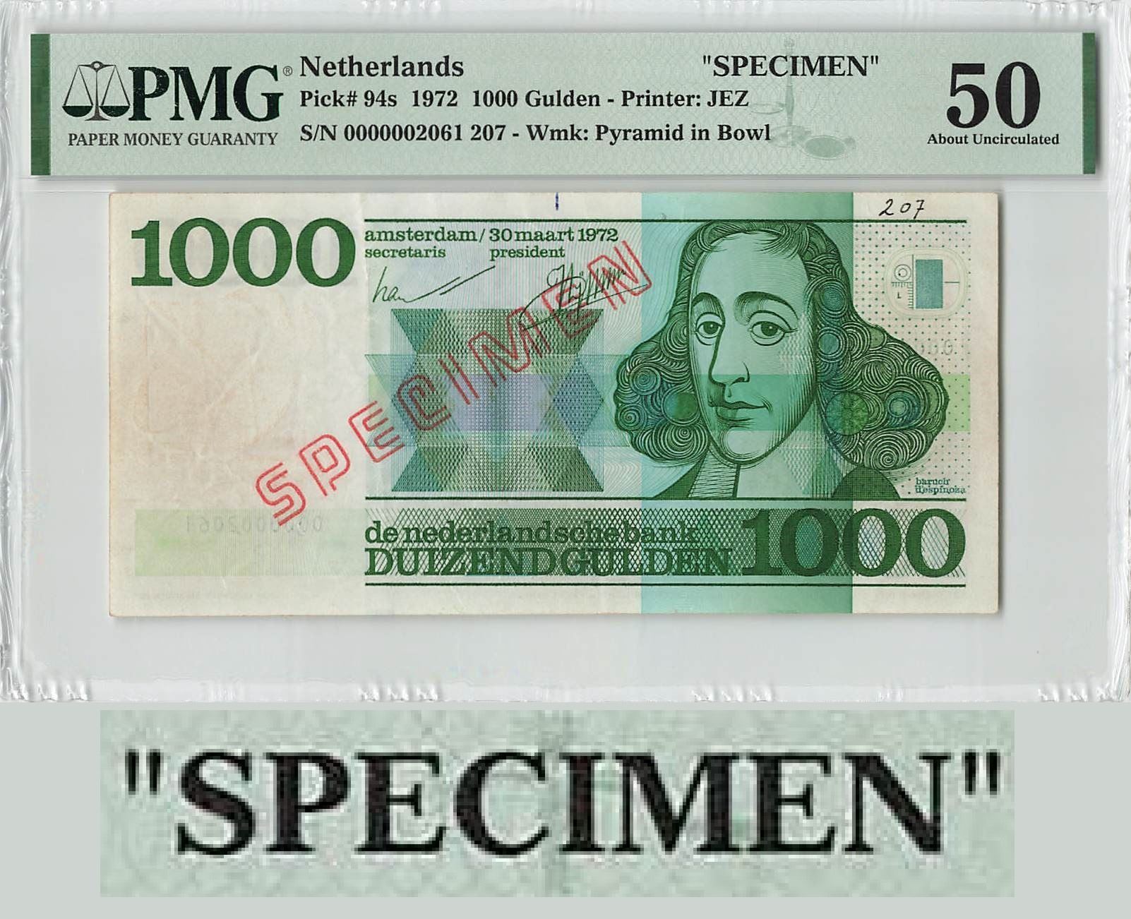 Netherlands 1000 Gulden 1972 Specimen Spinoza Pick 94s PMG About Uncirculated 50