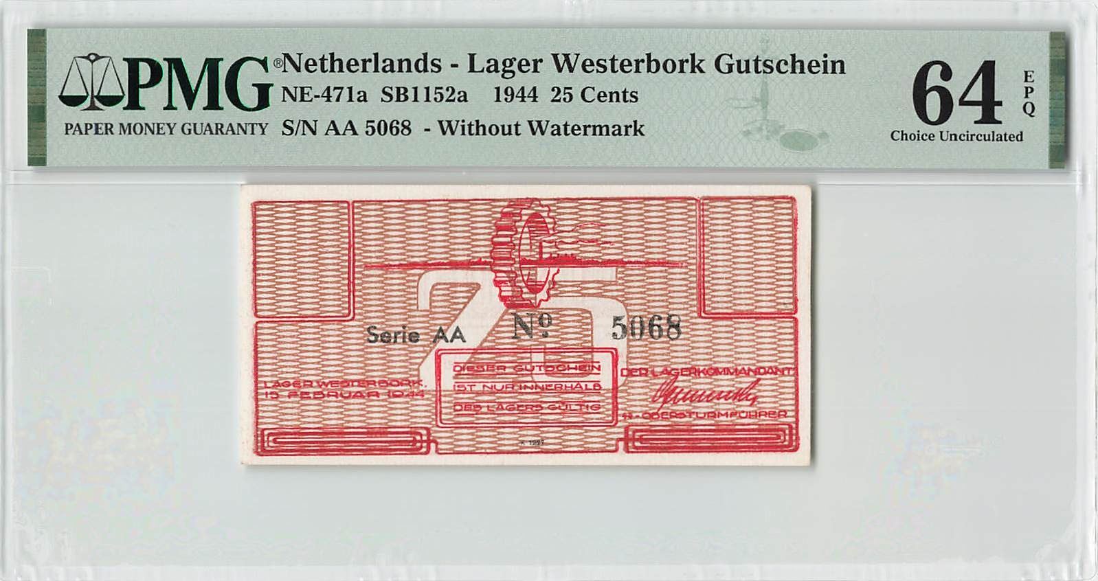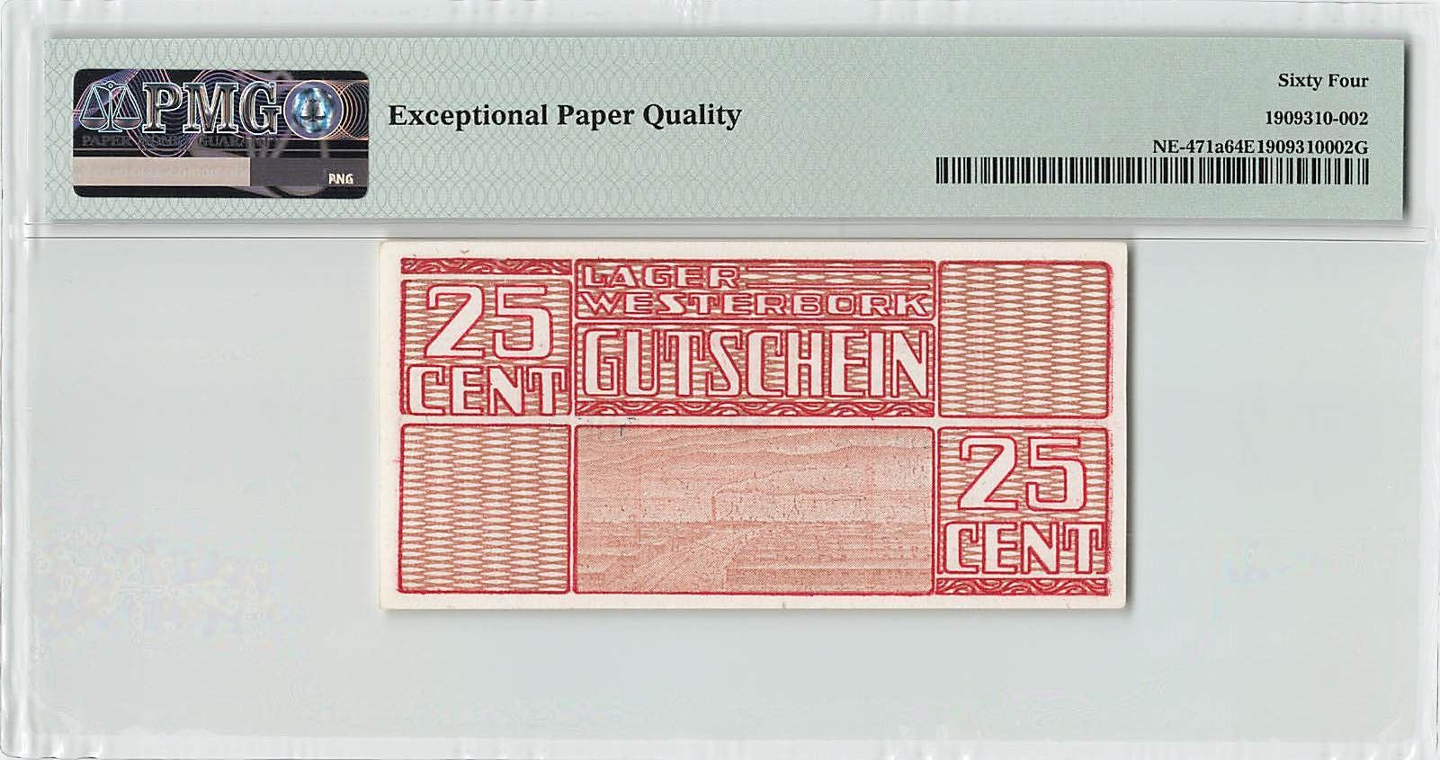 Netherlands 25 Cents 1944 AA w/o Watermark Lager Westerbork Gutschein (transit camp to concentration camps) PMG Choice UNC 64 EPQ