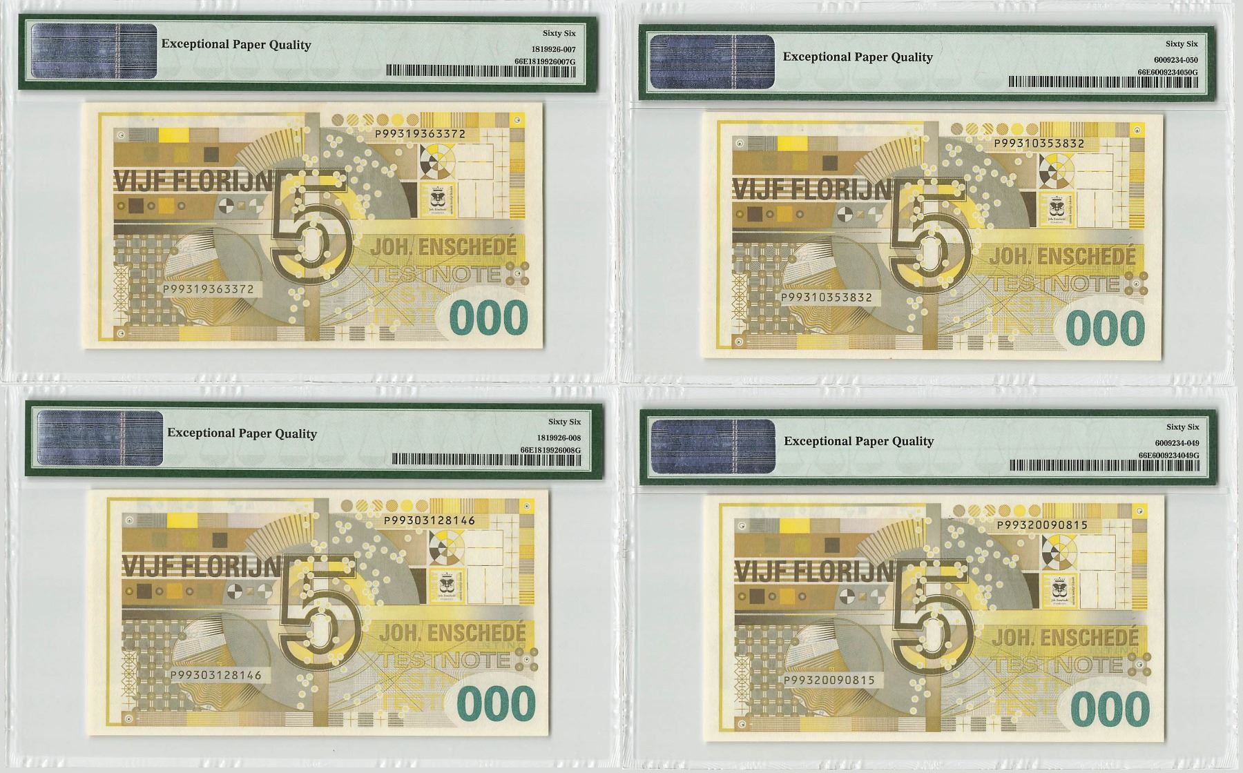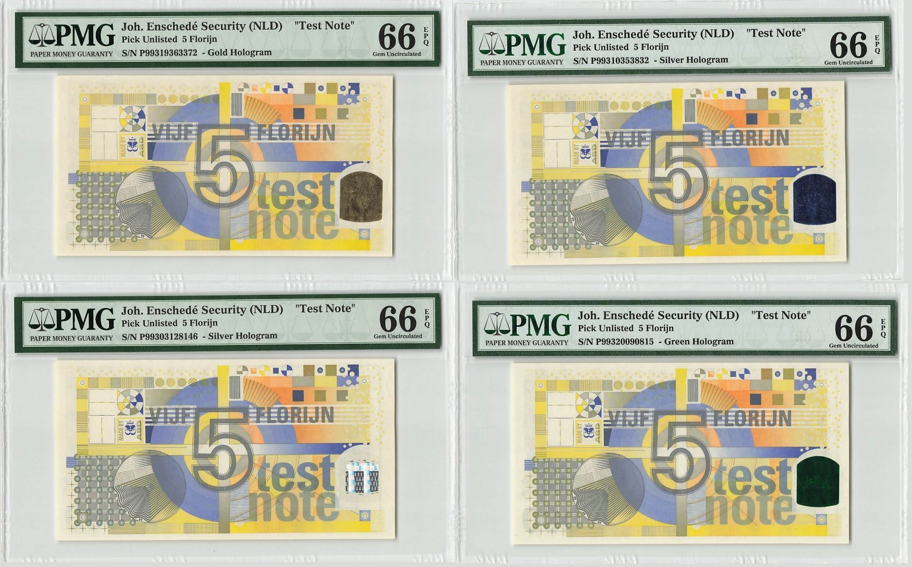 Netherlands 4x 5 Florijn 200 Euro Testnote Test Note Green / Silver / Gold / Blue Hologram PMG Gem UNC 66 EPQ