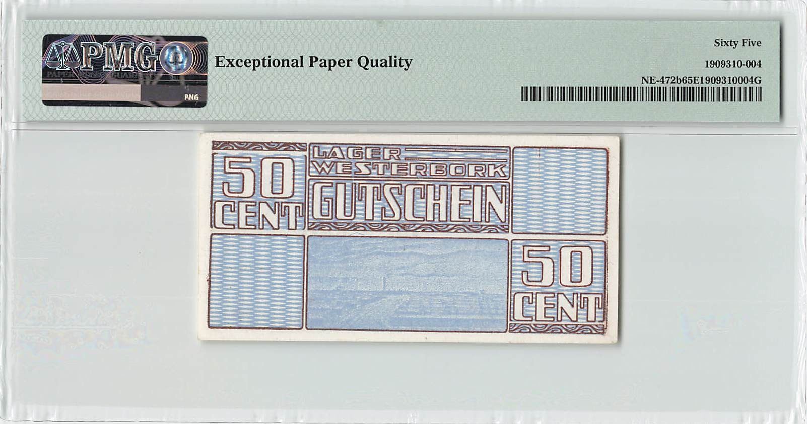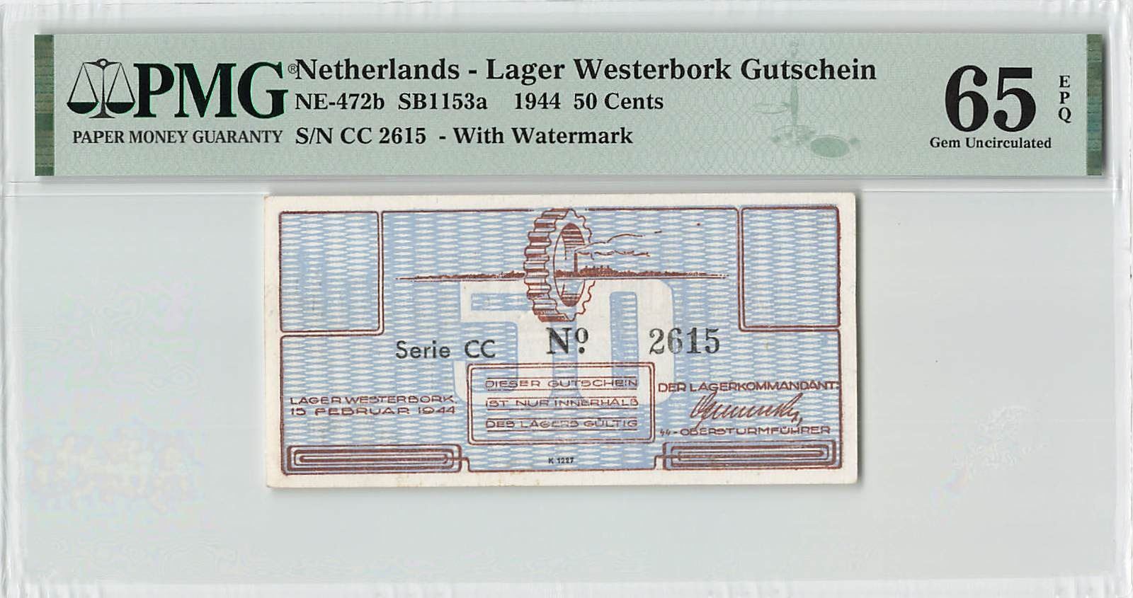 Netherlands 50 Cents 1944 CC with Watermark Lager Westerbork Gutschein (transit camp to concentration camps) PMG Gem UNC 65 EPQ