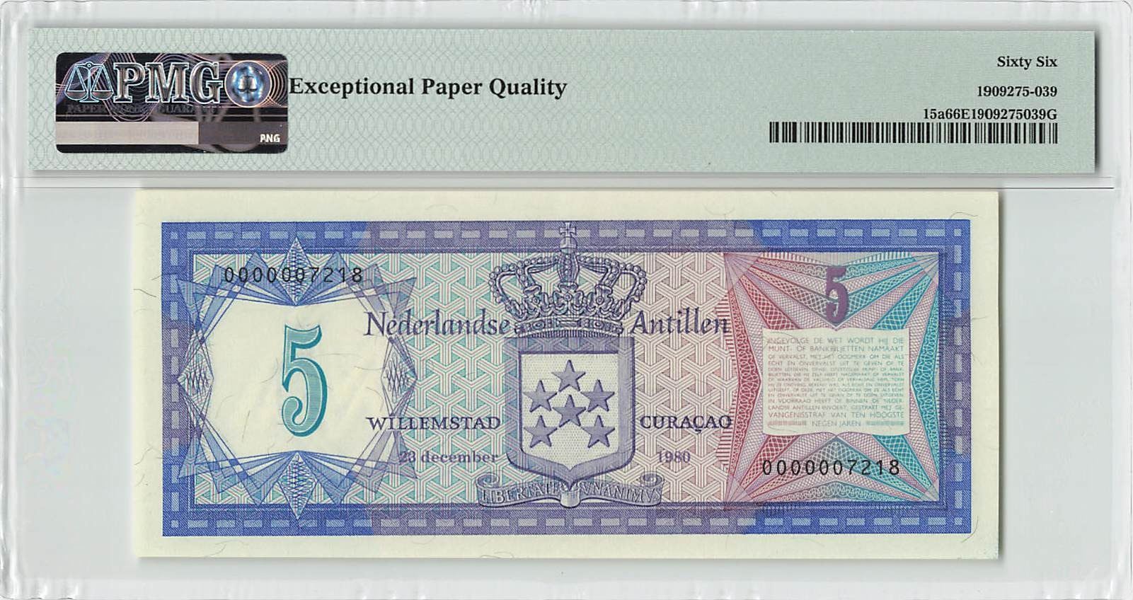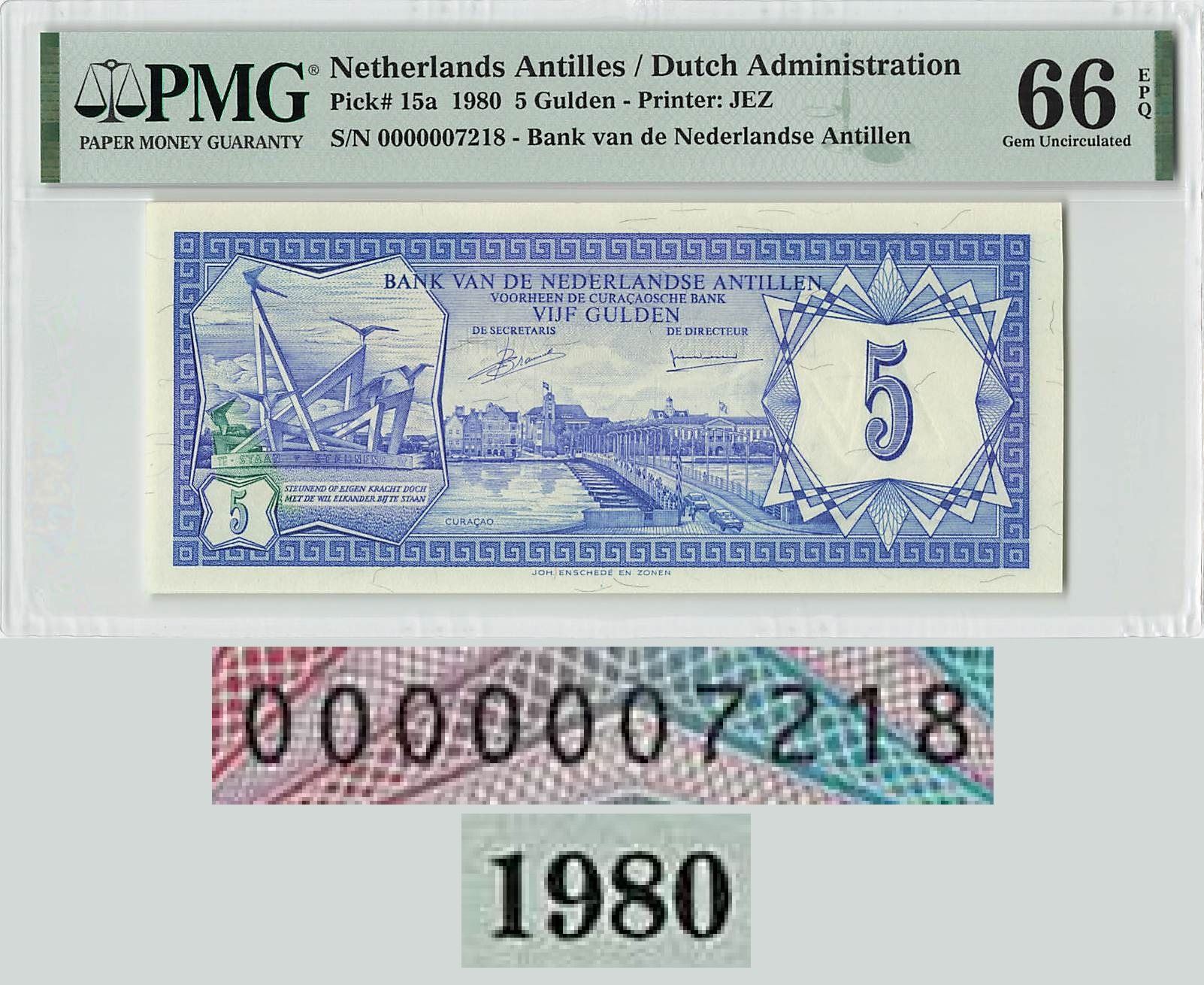 Netherlands Antilles 5 Gulden 1980 First Year and Low 7218 Serial! Pick 15a PMG Gem Uncirculated 66 EPQ