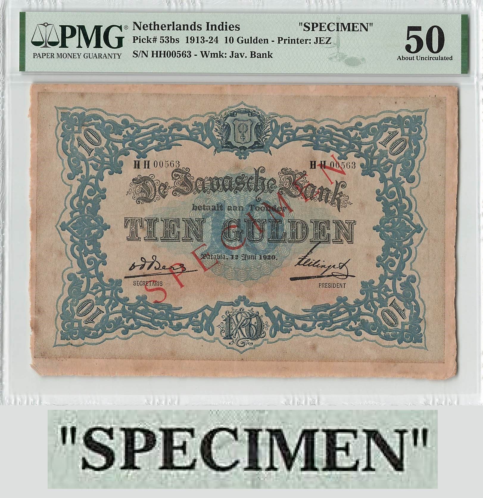 Netherlands Indies 10 Gulden 1920 Specimen Javasche Bank Pick 53bs PMG About UNC 50