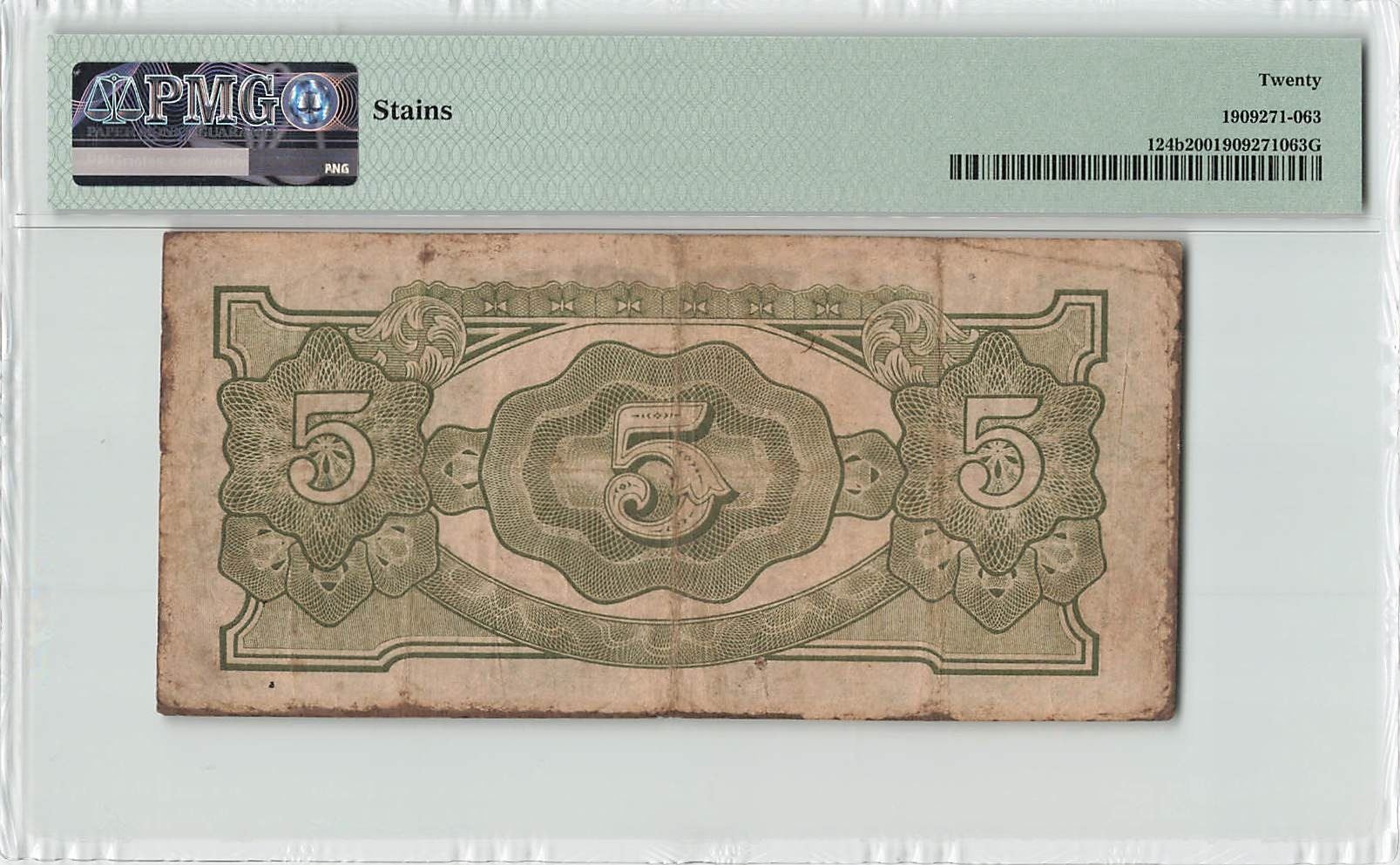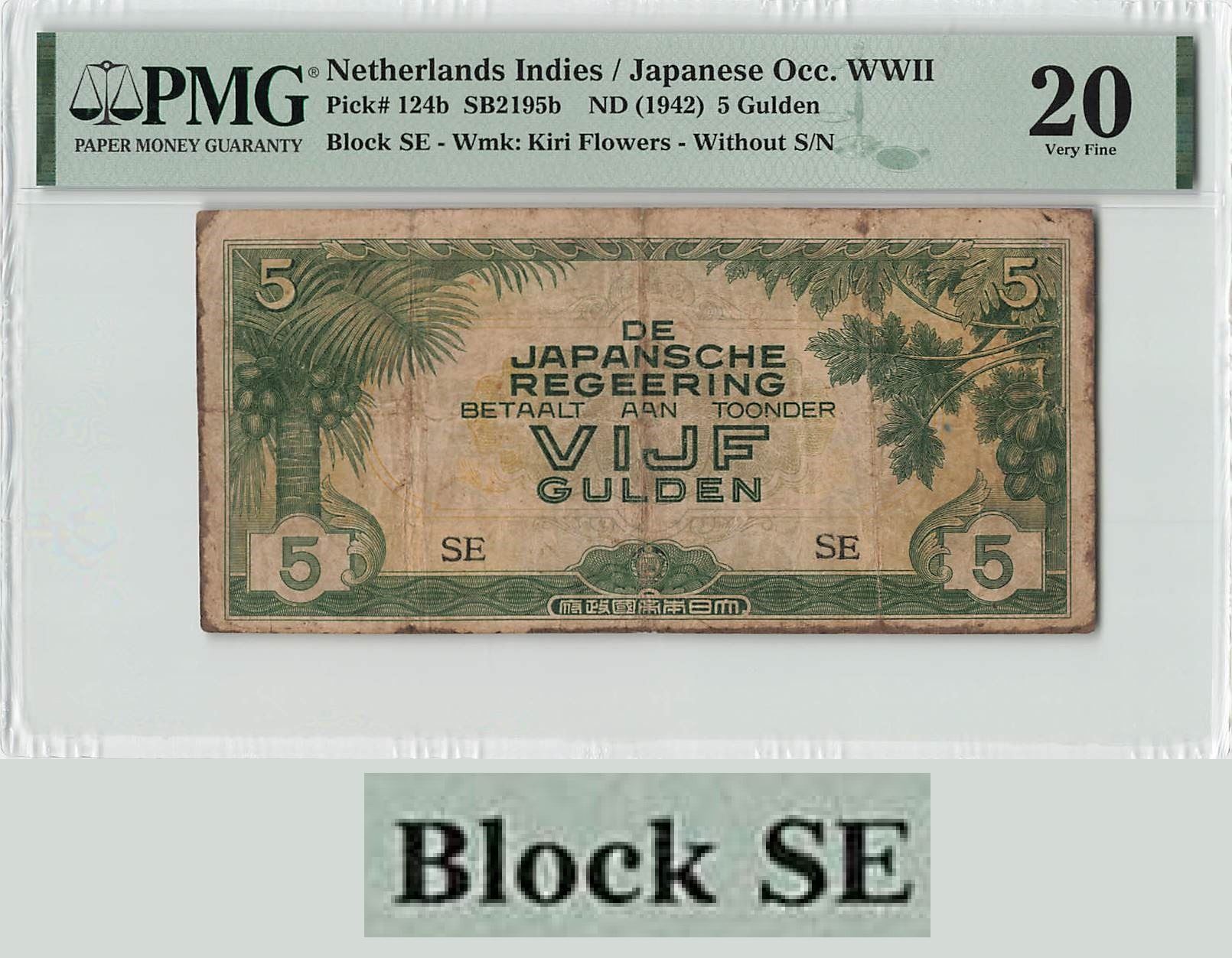 Netherlands Indies 5 Gulden 1942 Block SE Pick 124b PMG Very Fine 20