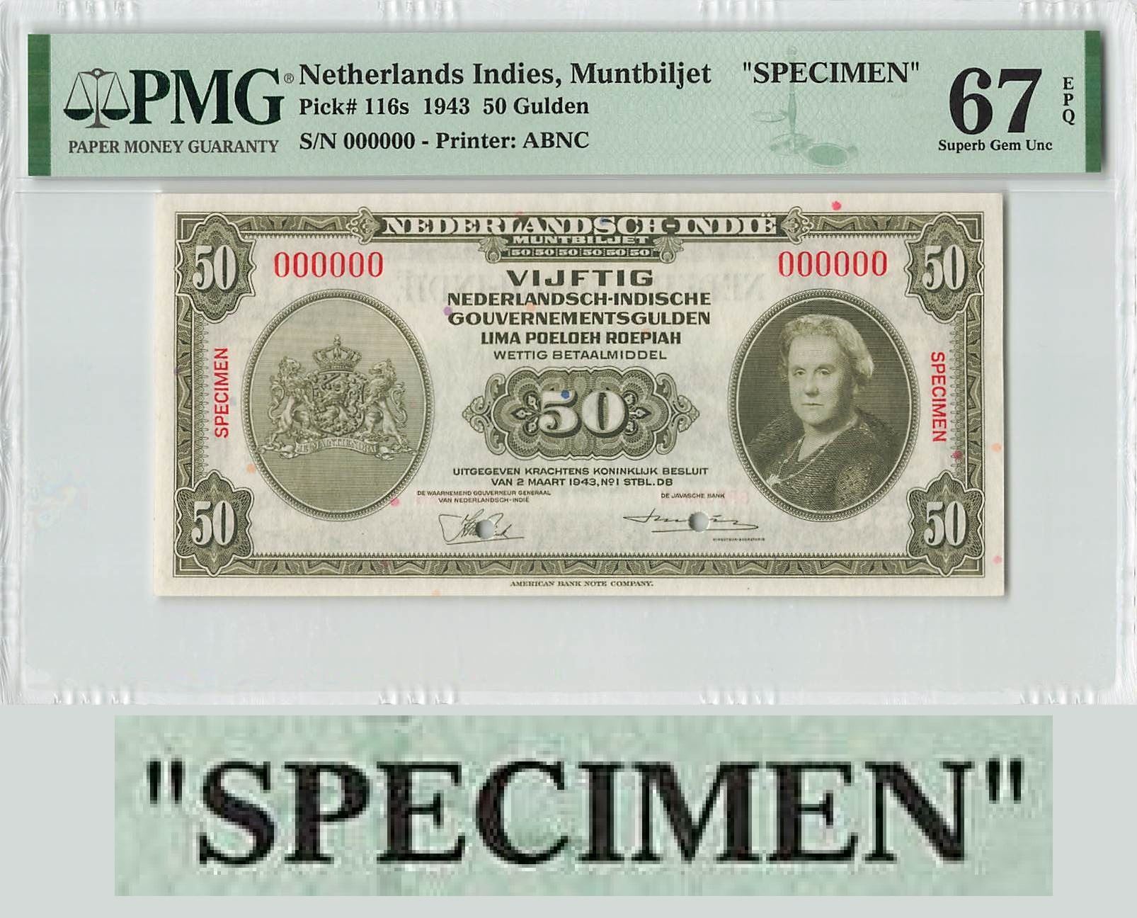 Netherlands Indies 50 Gulden 1943 Specimen ABNC Pick 116s PMG Superb Gem UNC 67 EPQ
