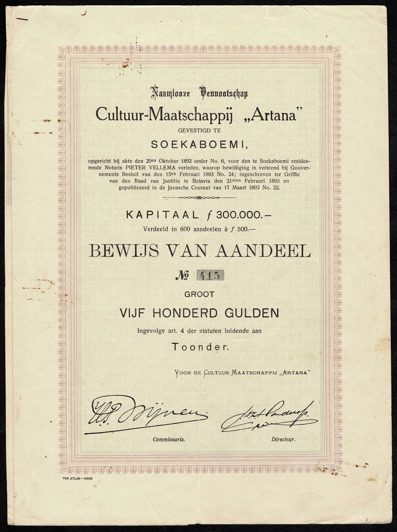 Netherlands Indies 500 Gulden 1892 Culture Society Artana Soekaboemi Bond