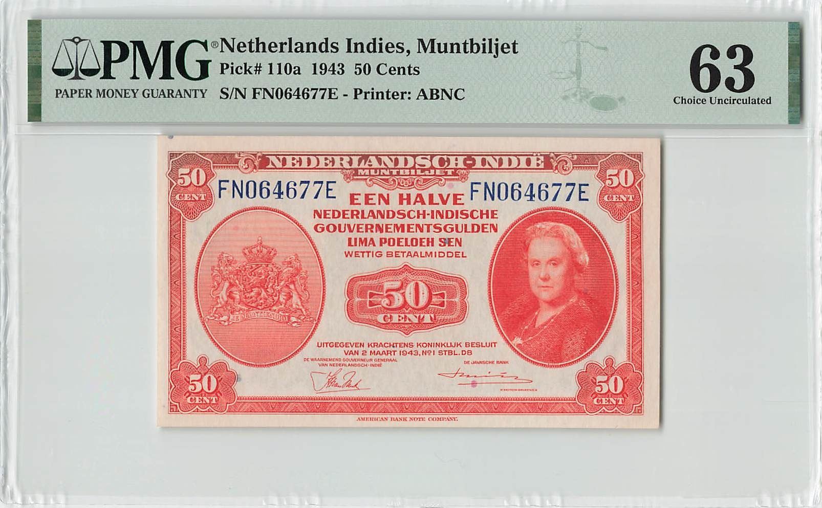 Netherlands Indies ½ Gulden 1943 ABNC Pick 110a PMG Choice UNC 63