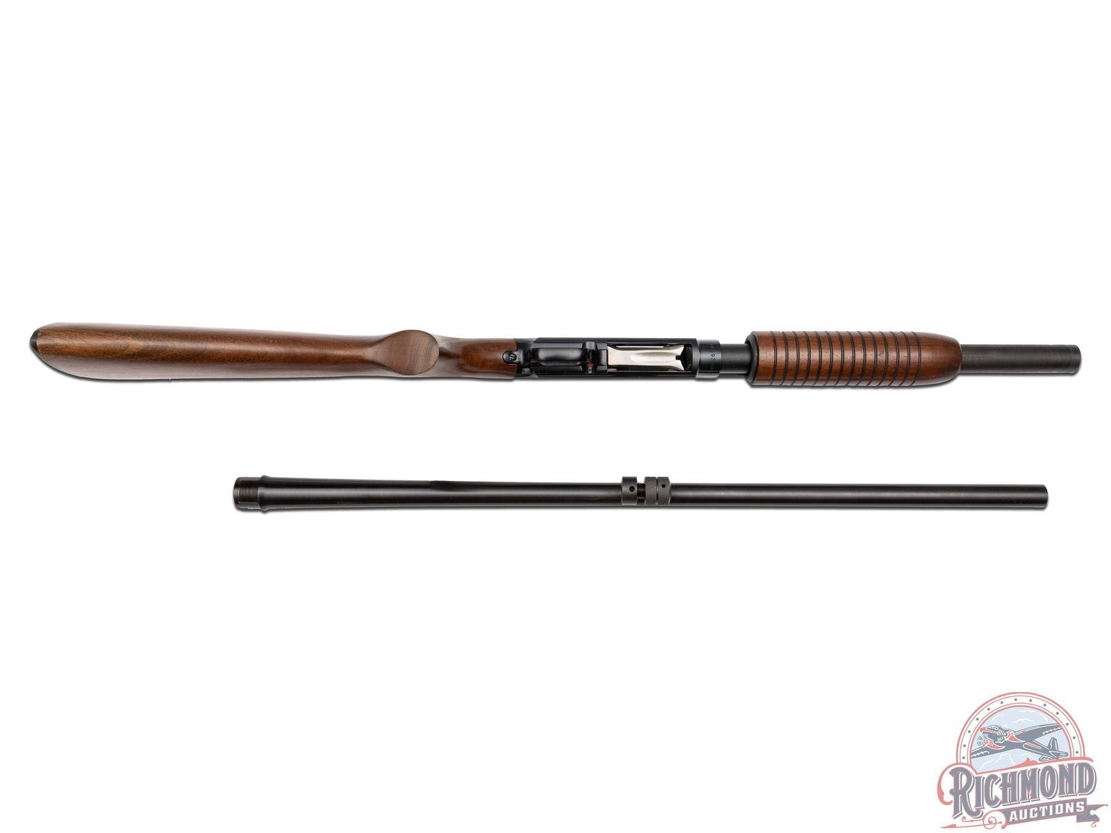 Manufactured in 1961. This Featherweight shotgun features a 28" round blued barrel chambered for 2-3/4" shells with modified choke and nickel bead front sight. Blued receiver, 5 round magazine tube and crossbolt safety. Smooth walnut stock with pistol grip and ribbed forearm. Comes in the original take-down factory cardboard box with factory manual and original hanging tag. LOP: 14". DAC: 1-1/2". DAH: 2-1/4". CALIBER: 12 GA. S/N: 1819358F. FFL STATUS: Curio & Relic.