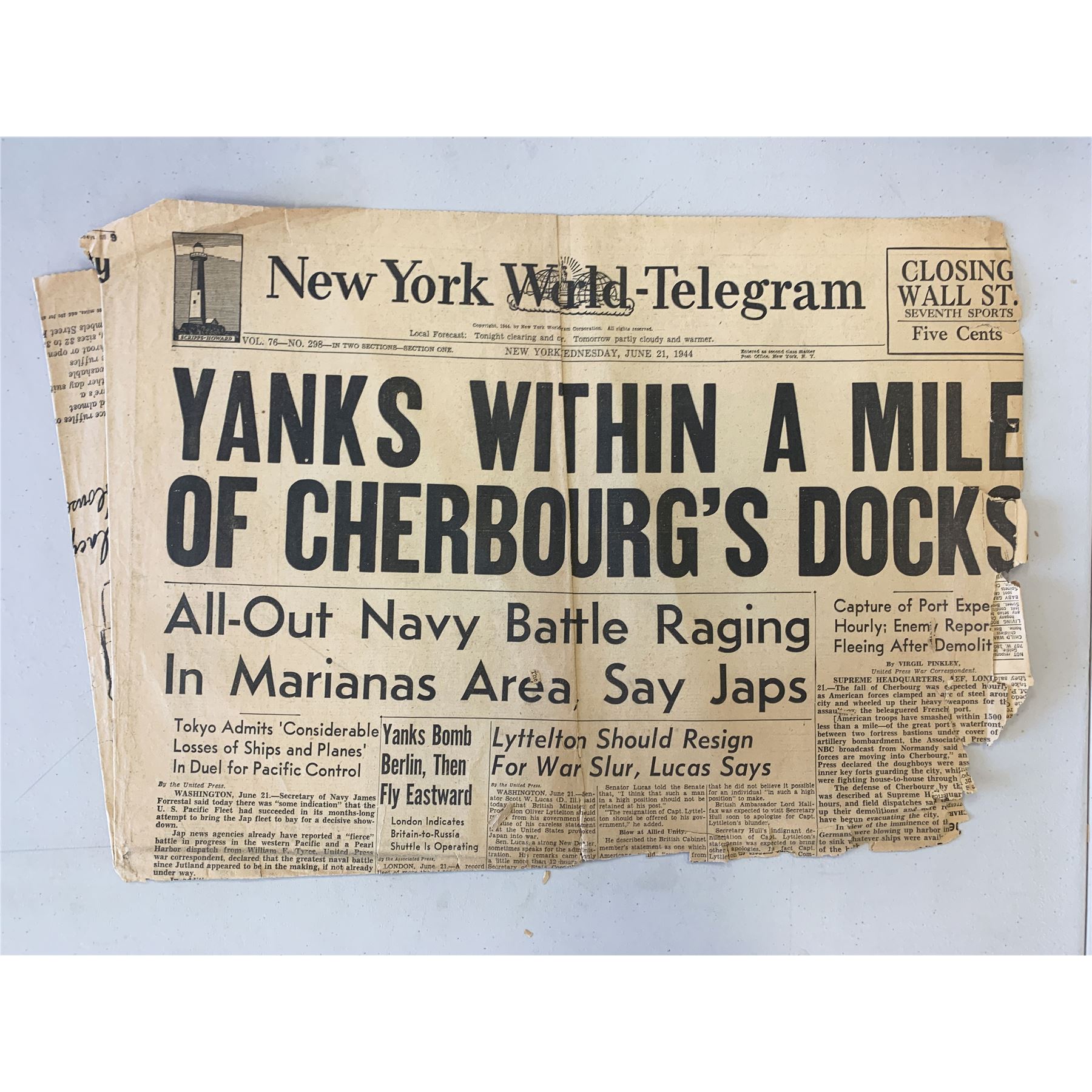 New York World - Telegram Original Vintage Newspaper - Wednesday June 21st 1944 - Battle of Normandy. Includes Wear and Tear. Not For Reading. 11x17 inches