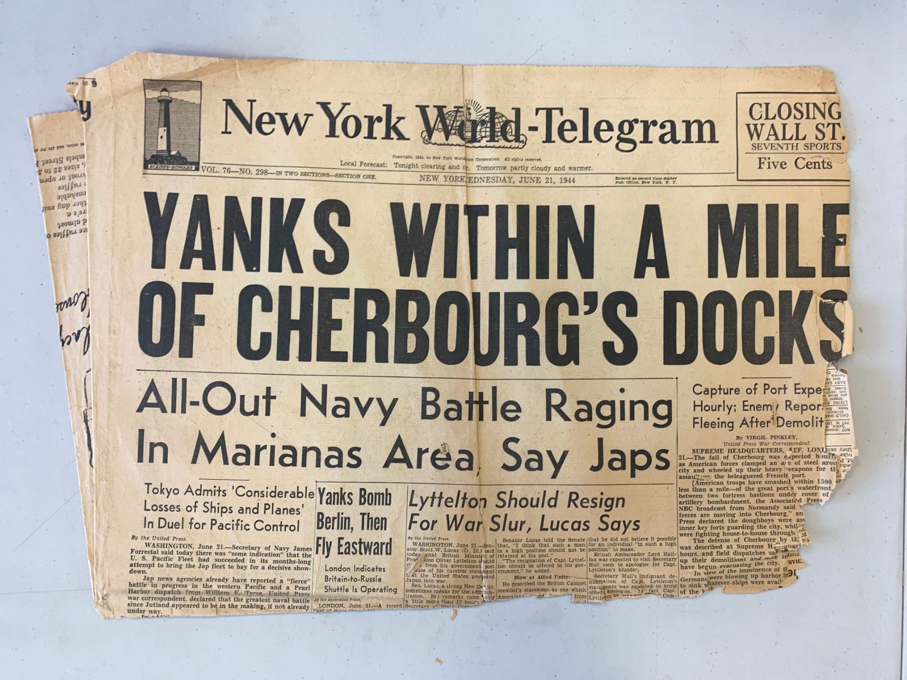 New York World - Telegram Original Vintage Newspaper - Wednesday June 21st 1944 - Battle of Normandy. Includes Wear and Tear. Not For Reading. 11x17 inches