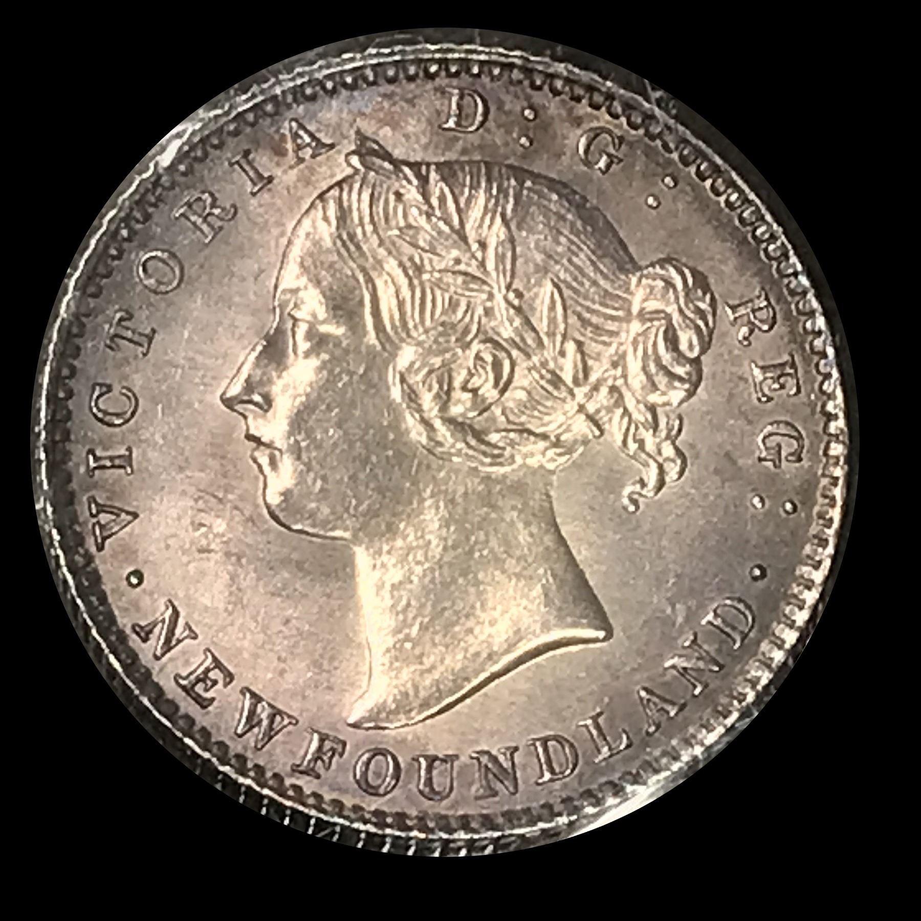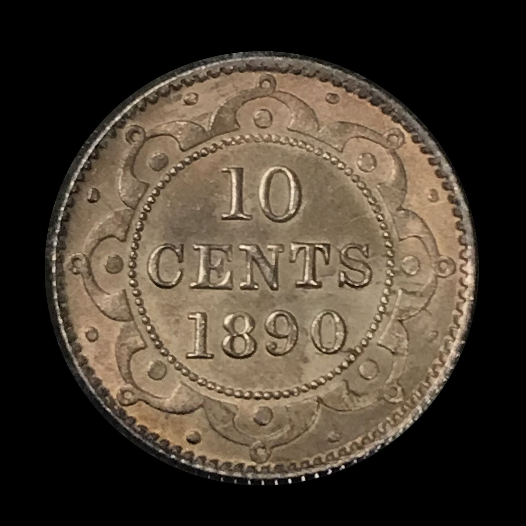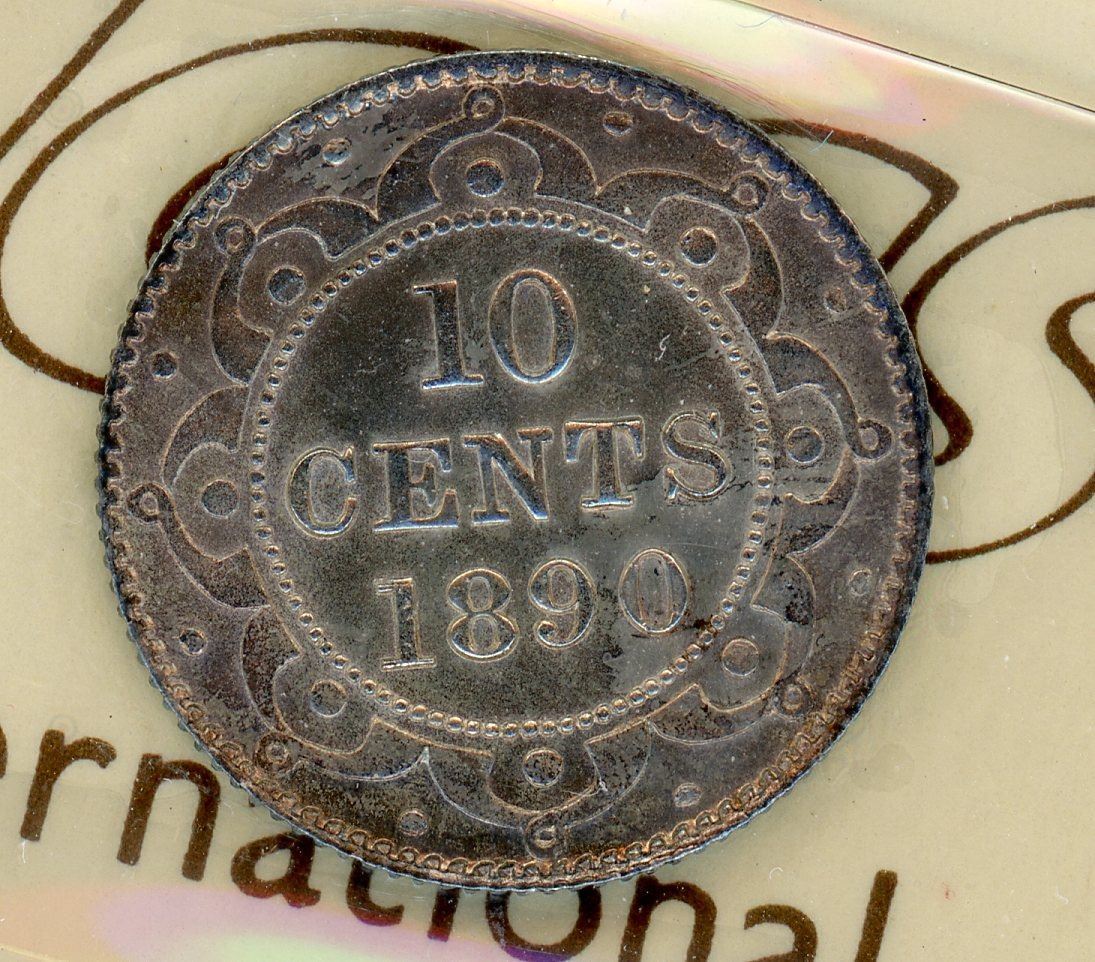 ICCS AU-58 with light golden reverse toning, lovely violet hues on obverse. Among the nicest of any Victorian Newfoundland dimes we've handled in 30 years.