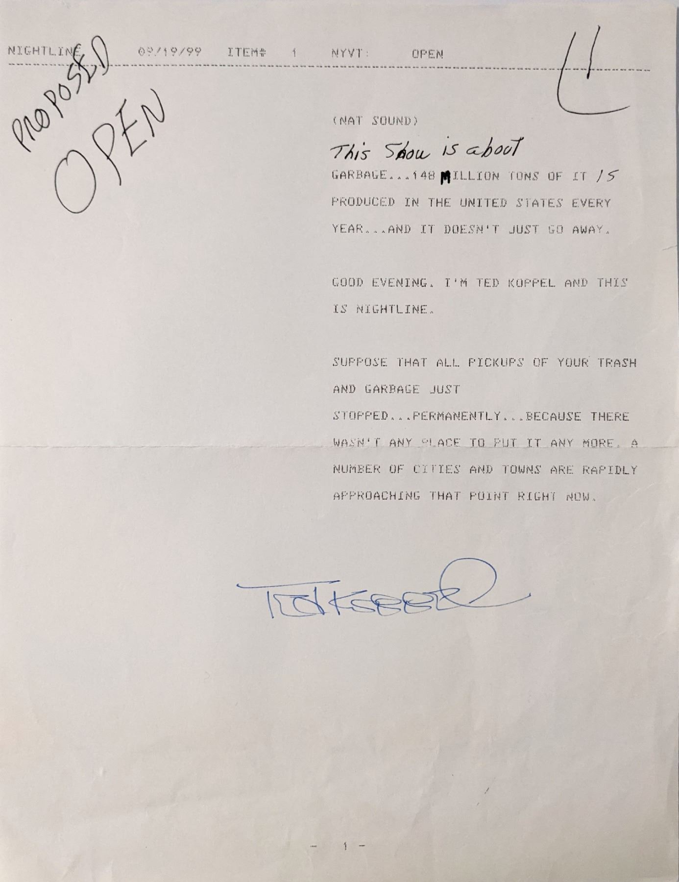Newscaster Ted Koppel signed script. 9 x 11 inches.