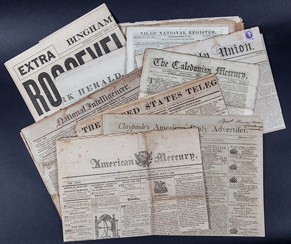 (1)The Caledonian Mercury, Edinburgh, April 29, 1769; with news of the Barbary Pirates and a red tax stamp (2) Claypoole's American Daily Advertiser, Philadelphia, August 6, 1799; offering rewards for Army deserters and a runaway slave (3) National Intelligencer, Washington City, March 12, 1814; War of 1812 news (4) American Mercury, Hartford, Connecticut, July 11, 1826; stories on the deaths of John Adams and Thomas Jefferson (5) The United States Telegraph, Washington City, July 6, 1831; story on James Monroe's death (6) Albany Weekly Journal, Albany, April 10, 1841; story on the death of President William Henry Harrison (7) Niles National Register, Baltimore, March 27, 1847 (8) The Daily Union, City of Washington, July 27, 1849; story asking for bids for supplies for various forts (9) The New York Herald, New York, April 21, 1864; Civil War news, also Maximilian and Garibaldi; and (10) Binghamton Press, April 12, 1945; news of FDR's death.