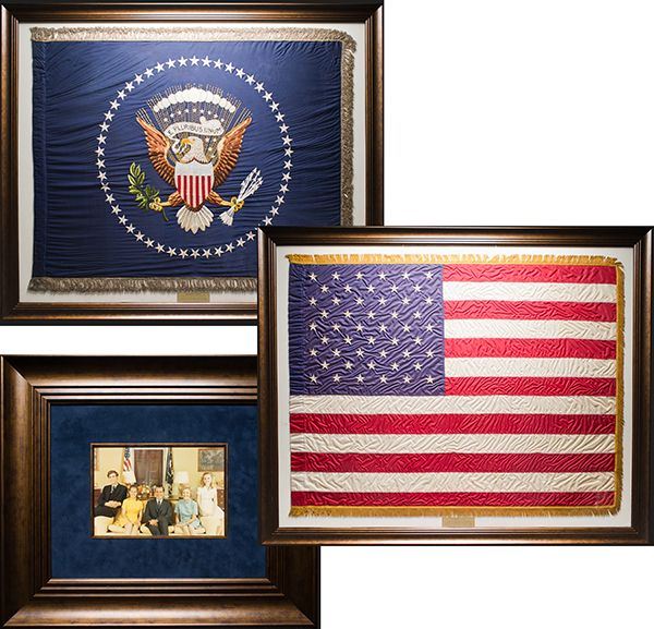 The flags are housed in fiberglass frames. They are not on site but are located in a western state. The buyer is responsible for arranging pick up and delivery. This may be a unique opportunity to obtain such historic mementos from the Oval Office.