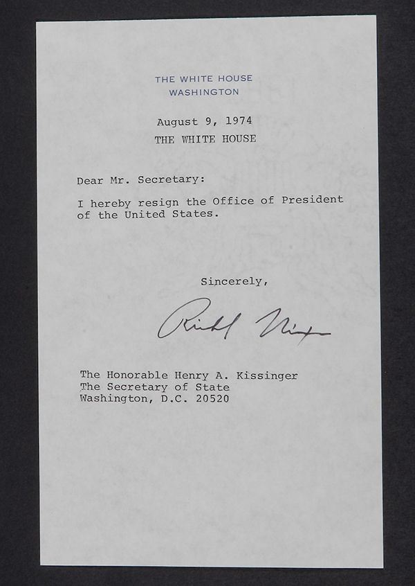 Nixon, Richard M. Typed Letter Signed on The White House watermarked stationery, 1 page, 5 x 8 in., Washington, 9 August 1974. Souvenir copy of Nixon's letter resigning the presidency, addressed to Secretary of State Henry A. Kissinger. Nixon was the first President in history to resign. He did so to avoid being impeached for covering up illegal activities of Republican party members during the Watergate affair. Excellent condition. The letter was actually signed by Nixon during his retirement in Saddle River, New Jersey. Ex Claude Harkins Collection.
